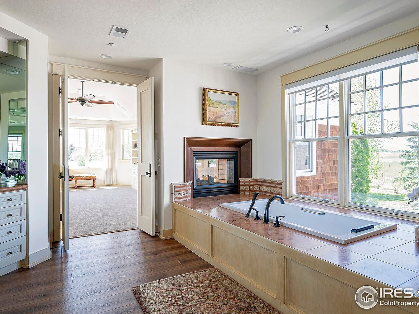 This master bathroom features a luxurious built-in bathtub framed by warm-toned tiles and a wooden base that complements the medium-hued hardwood flooring. The tub is positioned adjacent to a wide window, allowing natural light to fill the space and offering serene outdoor views. A corner fireplace with a dark wood trim and decorative tile surround adds a cozy and elegant touch, topped by a framed landscape painting. Light, neutral walls and trim maintain a bright and airy ambiance. Visible through open double doors, the connected bedroom showcases soft carpeting and ceiling fan details, promoting a seamless suite layout.
