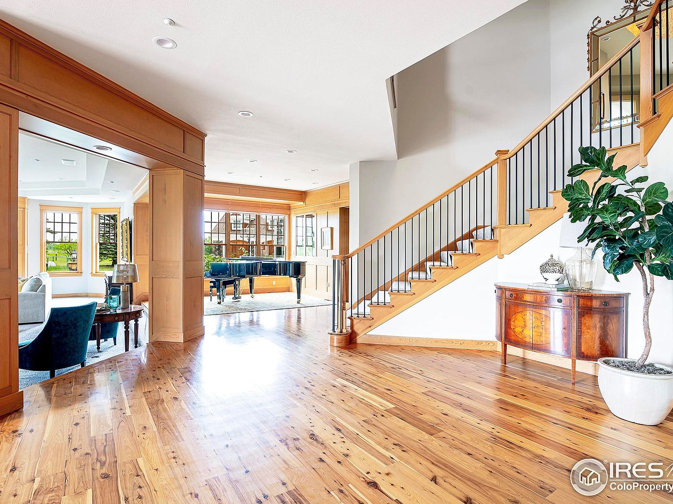 This welcoming entryway showcases warm wood flooring with natural grain and a polished finish that extends seamlessly into adjacent spaces. A staircase with wooden steps and black vertical balusters ascends along the right wall, highlighted by a large mirror above a classic wooden sideboard. To the left, the open transition leads into a bright living area, featuring large windows framed in matching wood trim. The space benefits from soft natural light and a classic aesthetic, which is enhanced by a grand piano placed under the windows, with a modern blue accent chair nearby adding a subtle pop of color.
