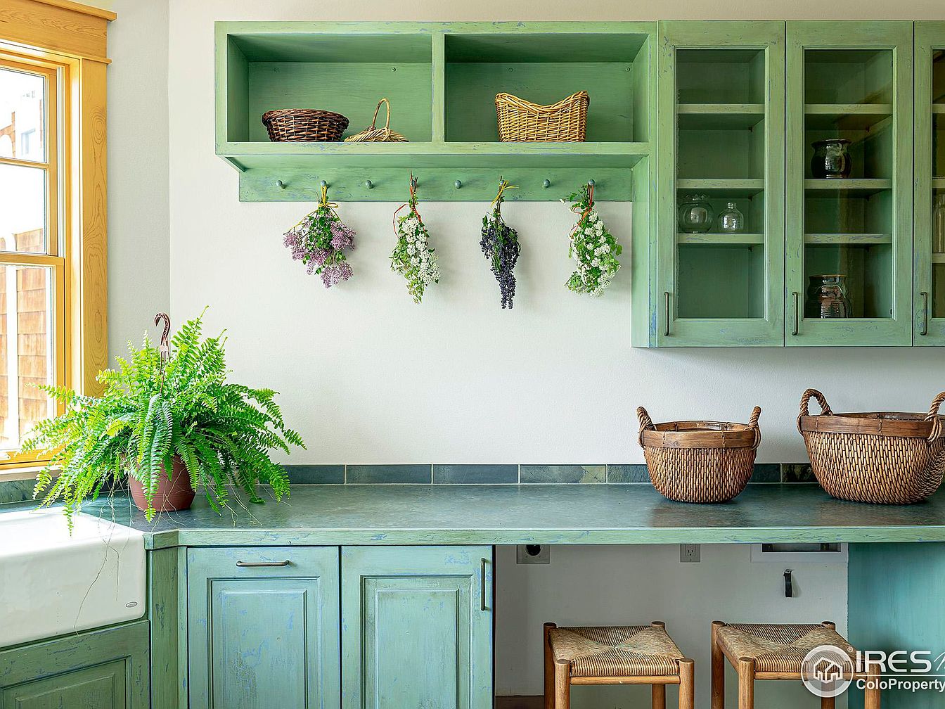This kitchen corner highlights a charming, rustic aesthetic with its muted green cabinetry and natural wood trim around the window. The countertop matches the cabinets with a slightly distressed green finish, adding depth and character. Above the counter, open shelving and glass-front cabinets offer both storage and display space, accented by wicker baskets and small decorative glass jars. Five bundles of dried flowers hang from wooden pegs, enhancing the cozy, farmhouse feel. A lush potted fern on the window ledge brings vibrant greenery to the space, while woven seating stools below hint at a casual and inviting atmosphere.