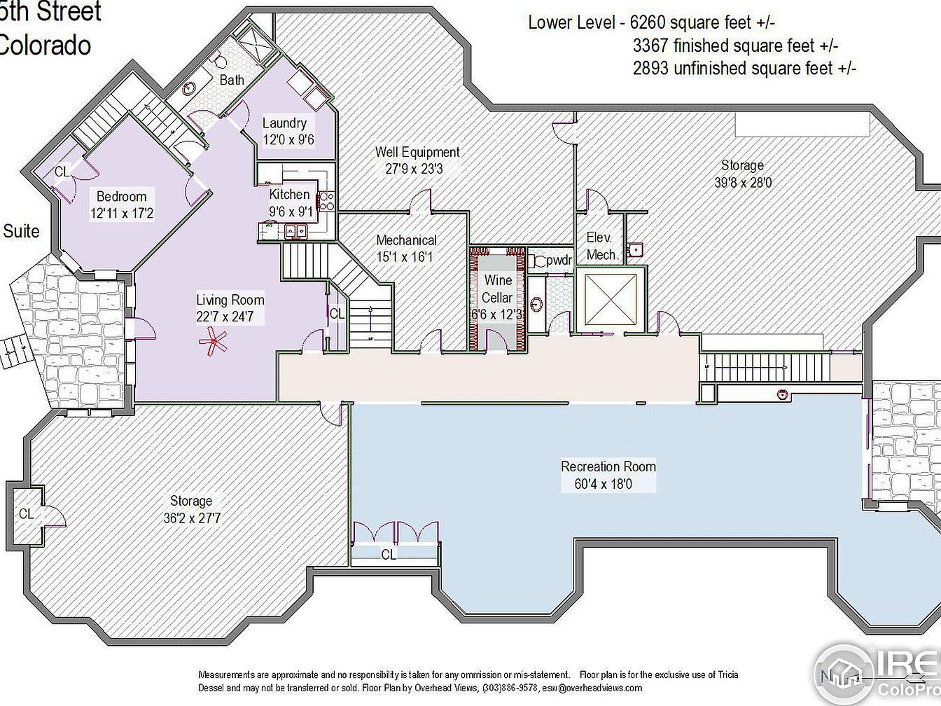 This spacious lower level spans approximately 6,260 square feet, featuring a variety of functional spaces thoughtfully arranged. A large recreation room dominates one side, measuring 60’4″ by 18′, providing ample area for entertainment or relaxation. Adjacent to this, dual storage rooms offer significant space for organization and belongings. The living room, sized at 22’7″ by 24’7″, connects to a compact kitchen and laundry area, enhancing convenience. A private bedroom with an attached bath and closet creates a suite-like retreat. Additional features include a wine cellar, mechanical room, elevator/mechanical access, and a powder room, all contributing to a well-equipped and versatile basement environment.