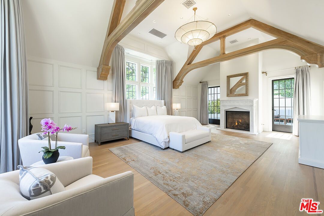 This spacious master bedroom features a serene, neutral color palette dominated by soft whites, light grays, and natural wood tones. The vaulted ceiling with exposed wooden beams adds architectural interest and warmth to the airy space. A large area rug in subtle shades grounds the room, complementing the hardwood floors. The bed is adorned with crisp white linens and flanked by two dark gray nightstands, each topped with a modern lamp. Cozy seating includes a plush white armchair with a patterned cushion and a side table adorned with vibrant pink orchids. Light gray curtains frame large windows, filling the room with natural light. A white fireplace with intricate molding and a simple wooden-framed mirror above provides a cozy focal point, while glass doors lead to an outdoor area, enhancing the open and inviting atmosphere.