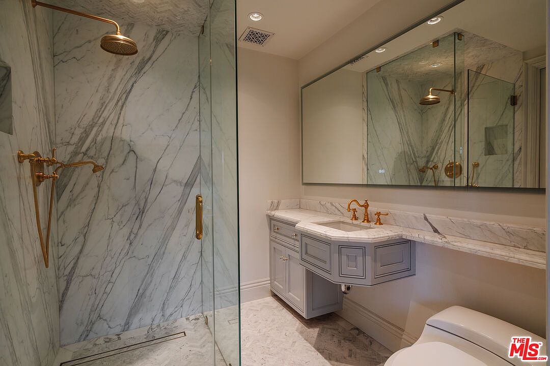 This bathroom features a spacious walk-in shower enclosed with clear glass, finished with luxurious marble walls and a recessed linear drain. The shower fixtures, including the rainfall showerhead and handheld spray, are in a warm brass tone, adding an elegant touch against the cool marble backdrop. The vanity is painted in a muted gray-blue, topped with a matching marble countertop that extends to create a seamless, floating effect. A large frameless mirror spans the wall above the vanity, enhancing the airy and bright ambiance. The floor continues the marble motif with subtle veining, complementing the refined aesthetic throughout the space. Soft, neutral wall tones and thoughtful lighting complete the sophisticated, spa-like atmosphere.