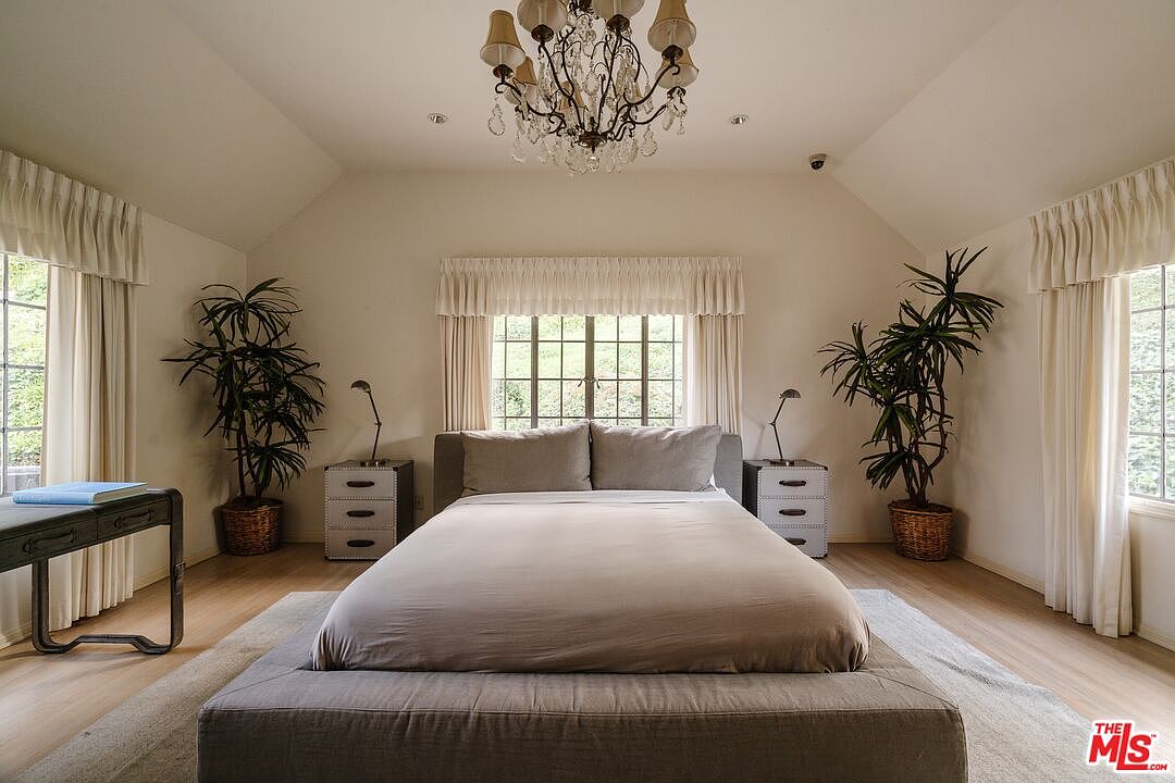 This serene bedroom features a minimalist design with a neutral color palette dominated by soft beige and muted taupe tones. The low-profile bed with plush gray bedding anchors the room, flanked by matching nightstands with contemporary lamps that provide balanced symmetry. Large windows on either side and behind the bed are adorned with simple, flowing cream curtains that allow natural light to filter gently throughout. Two potted plants bring a touch of nature indoors, complementing the light wood flooring and neutral area rug. An elegant ornate chandelier adds a subtle hint of classic sophistication to the clean, airy space.