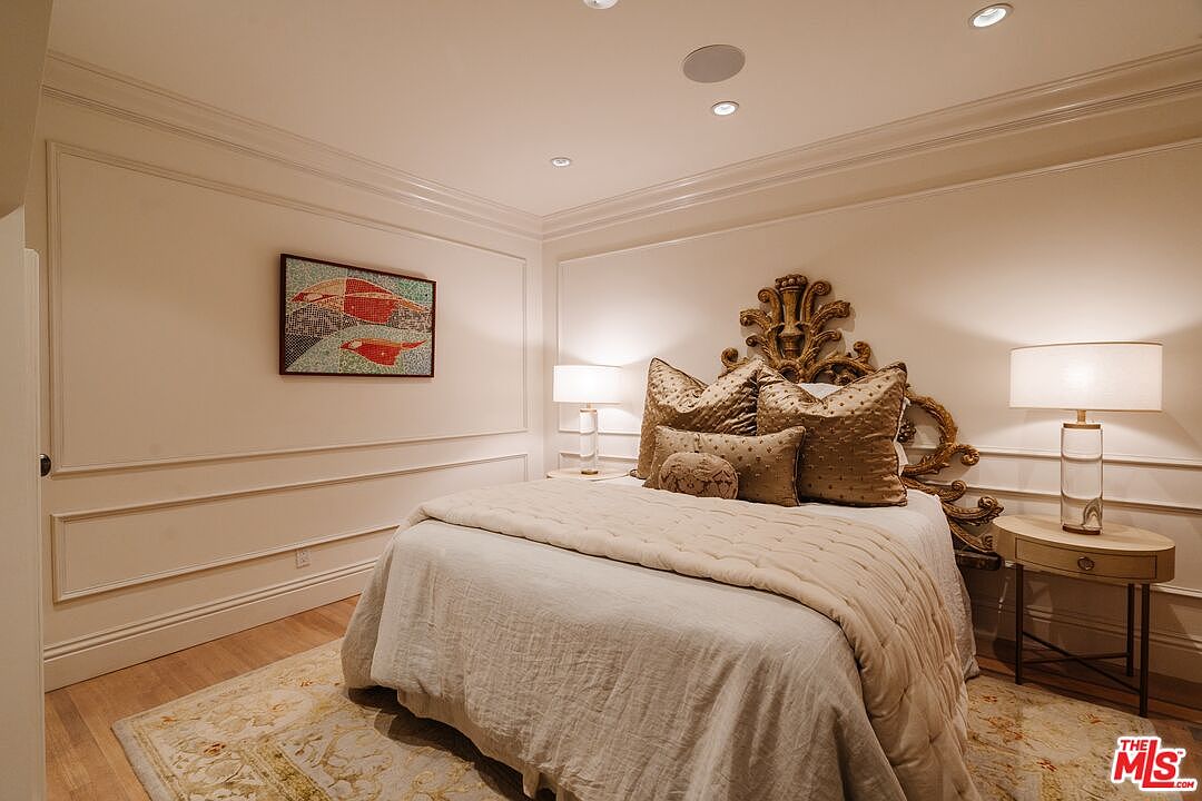 This intimate bedroom corner features an elegant, carved wooden headboard that serves as a focal point behind a plush bed layered with soft beige linens and a variety of textured taupe pillows. Two minimalist bedside tables hold matching lamps that emit a warm, ambient glow, complementing the neutral tones of the walls and the classic molding that adds a subtle architectural detail. The framed artwork with warm hues brings a splash of color to the otherwise muted palette. The space is grounded by a traditional patterned area rug that ties the warm wood flooring and soft textures together.