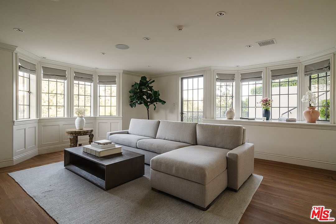 This living room area centers around a large, light gray sectional sofa with clean lines, positioned on a similarly toned textured rug that complements the hardwood flooring. The windows, arranged in a curved bay formation, flood the space with natural light and feature classic black muntins alongside neutral, light gray roman shades. The walls are adorned with minimalistic white wainscoting, enhancing the room’s elegant, understated charm. A dark wooden coffee table with an open shelf contrasts the light upholstery. Decorative accents include a large potted plant and strategically placed vases with subtle earth tones, completing the calm, inviting atmosphere.