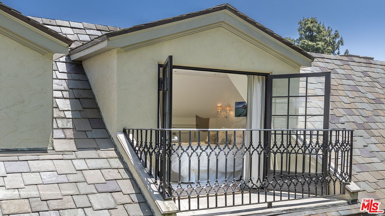 This cozy bedroom opens to a charming, small balcony with an ornate wrought iron railing, offering a touch of elegance and outdoor connection. The exterior features a slate-tiled roof and textured beige stucco walls, creating a classic, timeless look. French doors with black frames allow natural light to flood the room while providing seamless indoor-outdoor access. Inside, subtle wall sconces add warmth and ambient lighting, complementing a neutral, calm color palette. This intimate space balances architectural detail and comfort, ideal for quiet relaxation with views of the surrounding greenery.
