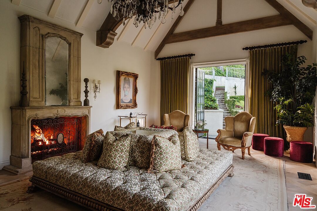 This elegant living room centers around a grand stone fireplace with intricate metalwork, radiating warmth and charm. The high vaulted ceiling features exposed wood beams, enhancing the room’s sophisticated yet cozy ambiance. A large, patterned daybed with plush cushions anchors the space, inviting relaxation. Two classic armchairs with carved wooden legs and upholstery sit opposite the daybed, creating an intimate seating arrangement. Rich olive curtains frame a wide doorway leading to a manicured outdoor stairway garden, blending indoor comfort with nature. Deep burgundy velvet stools and a large leafy plant add depth, color, and balance to the warm neutral tones and textured fabrics throughout.