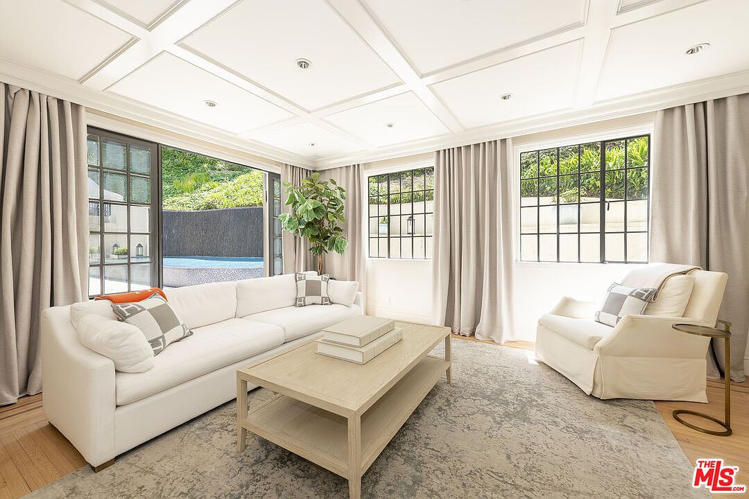 This bright, inviting family room features a crisp white color palette anchored by a clean-lined white sofa and matching armchair, both accented with neutral patterned pillows. The light wood coffee table with a lower shelf provides a natural, minimalist contrast, set atop a subtle grey textured rug that adds warmth and depth. Floor-to-ceiling beige curtains frame large, black-framed windows and glass doors that open to an outdoor pool area, allowing abundant natural light. The coffered ceiling with recessed lighting and the hardwood floor blend classic architectural detail with contemporary simplicity, complemented by a tall green plant for a fresh touch.