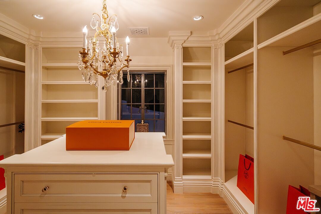 This spacious walk-in closet features a sophisticated and classic design with creamy off-white built-in cabinetry and shelving, accented by intricate moldings and fluted columns. Open shelves and multiple hanging rods provide ample storage for clothing and accessories. The warm wood flooring adds a natural touch, complementing the neutral color palette. A stunning crystal chandelier with gold detailing hangs in the center, lending an elegant and luxurious ambiance while illuminating the space. A large window with black framing allows natural light, balancing the room’s warm, inviting atmosphere. The bright orange shopping bags and a matching box add a pop of color against the otherwise neutral tones.