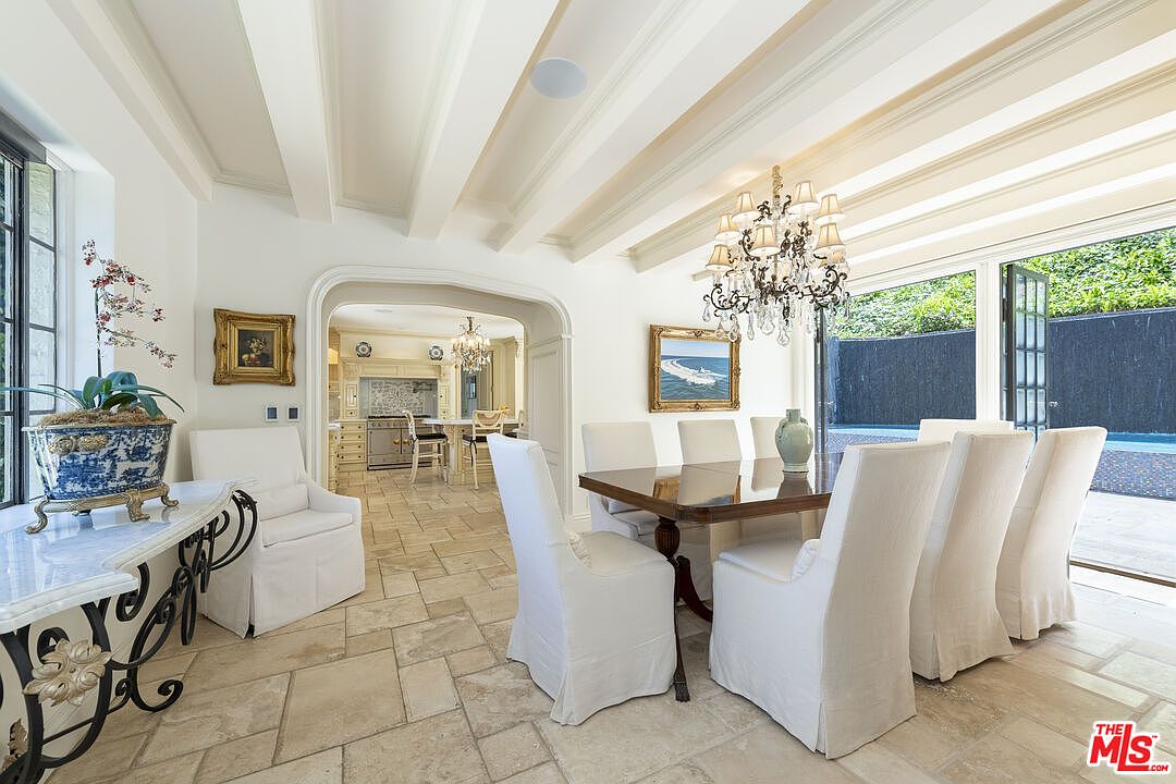 This elegant dining room features a rectangular wooden table surrounded by eight white slipcovered chairs, creating a crisp and inviting setting. The ceiling boasts exposed beams painted white that add architectural character and soften the ambiance. Natural light floods the room through large glass sliding doors that open to a private outdoor garden space, where green foliage and a pool can be seen. A classic crystal chandelier hangs above the table, providing a sophisticated touch. The cream-toned tile floor complements the neutral walls, while framed artwork and a decorative console table with ornate legs add subtle yet refined details.