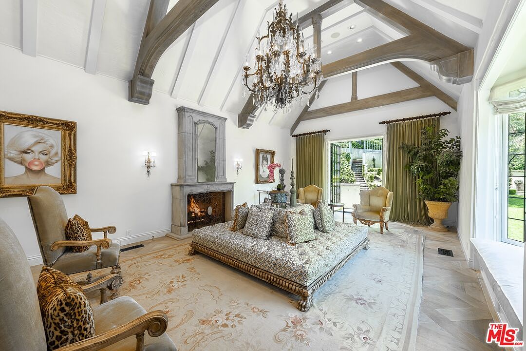 This living room features a high vaulted ceiling with exposed wooden beams stained in a warm gray tone, adding architectural interest and a rustic touch. A large ornate crystal chandelier hangs centrally, casting elegant light over the space. The walls are painted bright white, which contrasts beautifully with the soft beige and gold patterned area rug covering the polished stone floor. Classic armchairs with leopard print accent pillows flank a large, richly upholstered square ottoman in the center, surrounded by various decorative cushions. A stone fireplace with a mantel serves as a focal point, flanked by delicate wall sconces. French doors open to a lush garden, while muted olive-green heavy curtains frame the windows, enhancing the room’s luxurious, refined atmosphere.