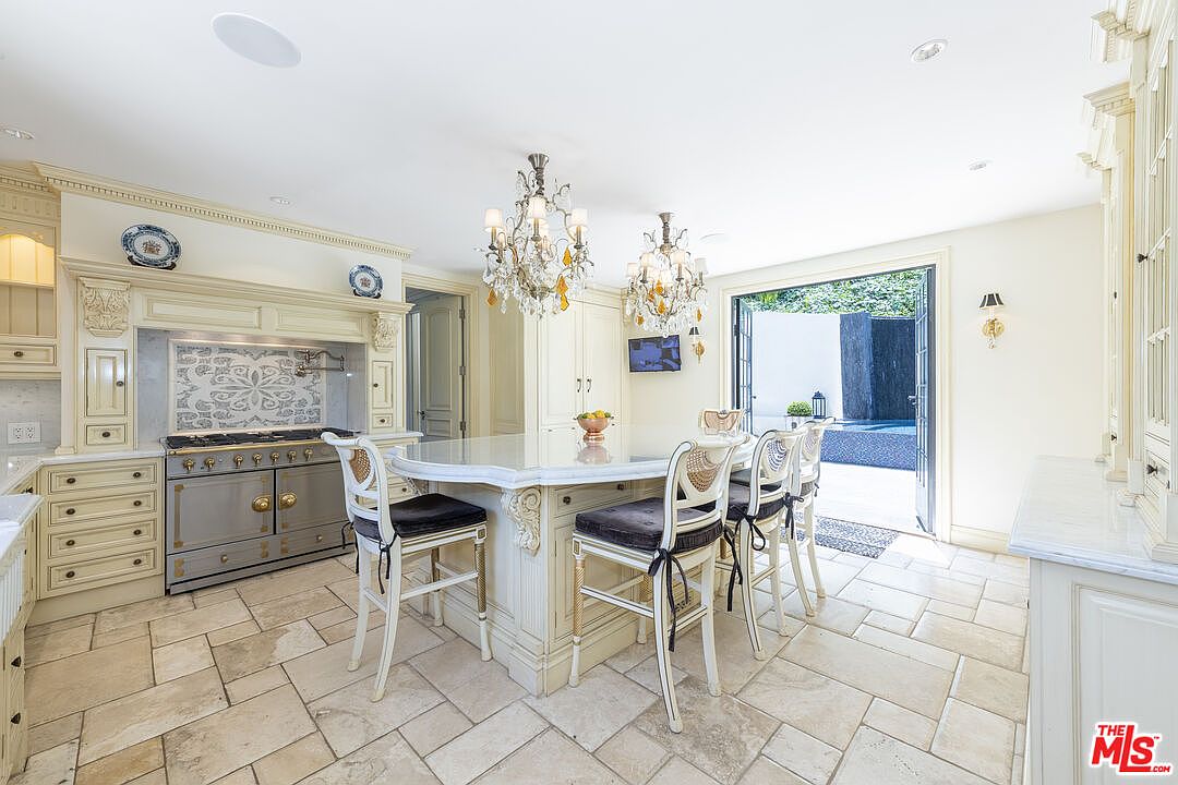 This kitchen exudes timeless elegance with its soft cream cabinetry and intricate molding details. The large central island features a polished white marble countertop with carved corbels supporting the overhang, surrounded by four cushioned high-back chairs with black seats tied in neat bows. Underfoot, the natural stone tile flooring adds warmth with its varied beige tones and subtle texture. Two ornate crystal chandeliers hang above the island, complementing the room’s refined style. A wide French door opens seamlessly to an outdoor space, flooding the kitchen with natural light and blending indoor and outdoor living. The vintage gray range with brass hardware, set against an elaborately tiled backsplash, adds a classic focal point.