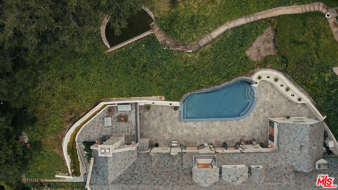 This expansive backyard offers a serene retreat featuring a uniquely shaped swimming pool that blends into a vast stone patio. The light gray stone paving enhances the sophisticated yet natural aesthetic, creating a generous lounging area with multiple seating options for relaxation and social gatherings. Adjacent to the pool is a cozy outdoor seating nook defined by a low wall, adding an intimate setting for fireside conversations. The yard is bordered by lush greenery and mature trees, providing privacy and a connection to nature. Curving garden pathways and manicured plants add gentle, organic shape contrast to the clean architectural lines of the home’s rooftop.