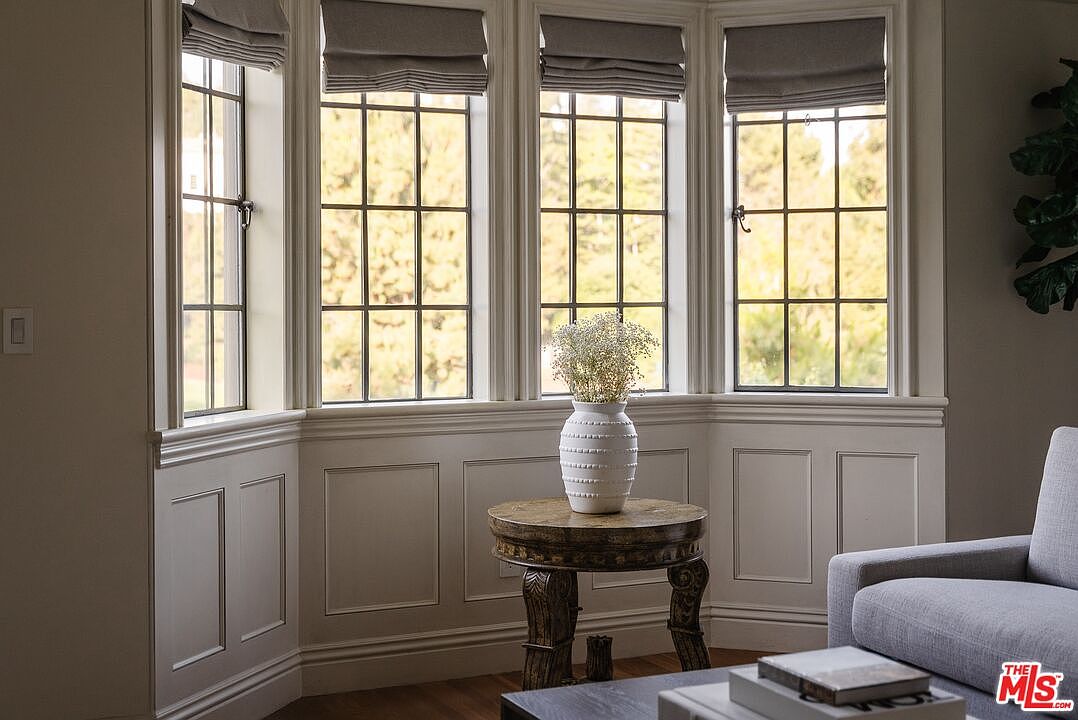 This cozy corner of the living room features a charming bay window with three large, grid-paned windows framed in crisp white trim, allowing abundant natural light to flood the space. Soft beige walls complement the classic white paneling beneath the windows, adding traditional architectural detail. A rustic, round wooden side table stands centered in the alcove, topped with a textured white ceramic vase containing delicate baby’s breath flowers, enhancing the room’s inviting warmth. Adjacent to the nook, a light gray upholstered sectional contributes a modern touch, balancing the room’s timeless and serene aesthetic perfectly.