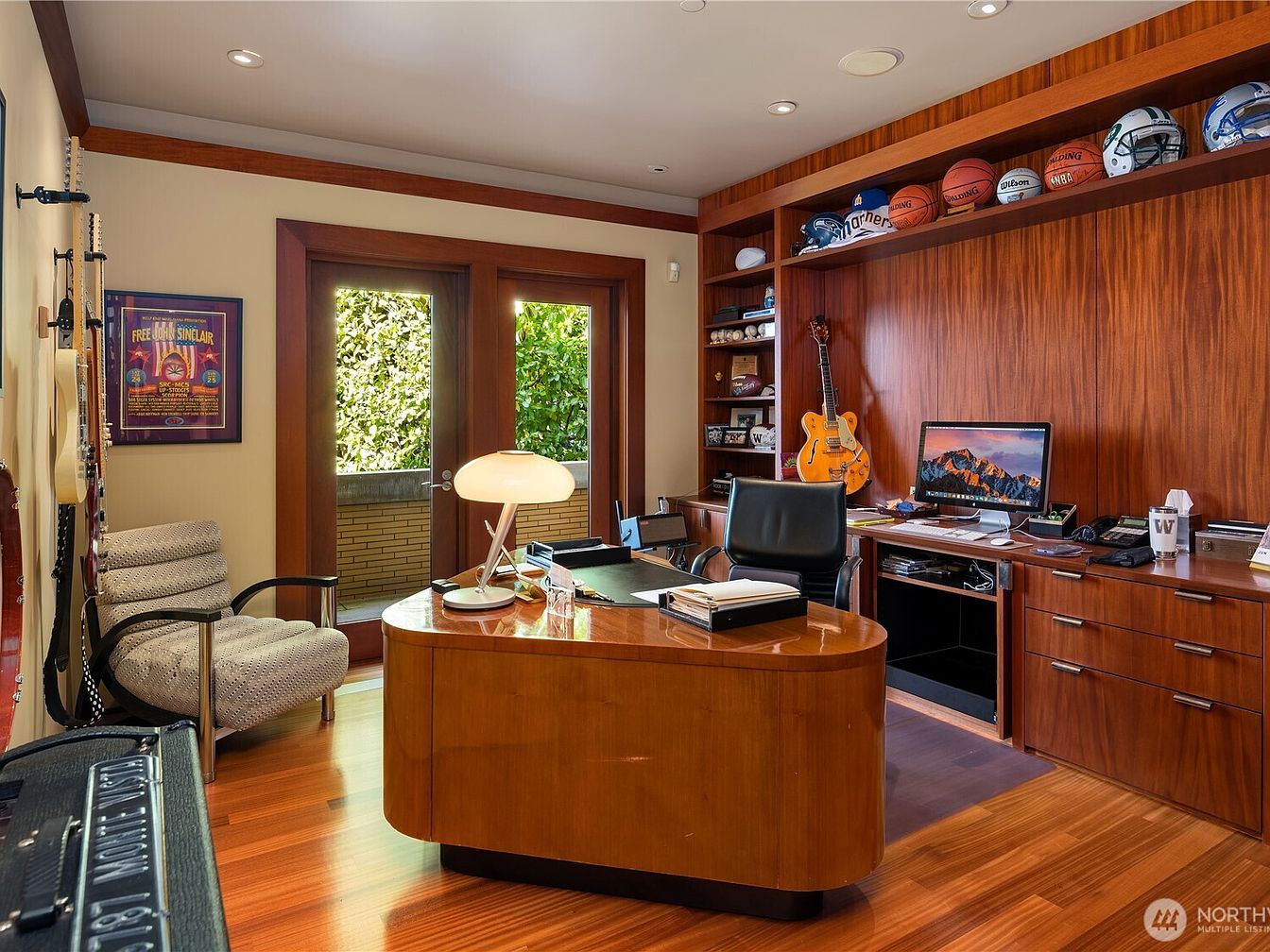 This home office features a warm, inviting atmosphere anchored by rich wood finishes that cover the desk, built-in shelving, and surrounding walls. The uniquely curved wooden desk commands the center of the space, paired with a sleek black leather office chair. Natural light filters through double French doors framed in wood, enhancing the honey-toned hardwood floors. Display shelves showcase a collection of sports memorabilia and musical instruments, including guitars mounted on the side wall and a striking orange guitar standing near the desk. A cozy patterned armchair nestles into the corner, making this workspace both functional and inspiring.