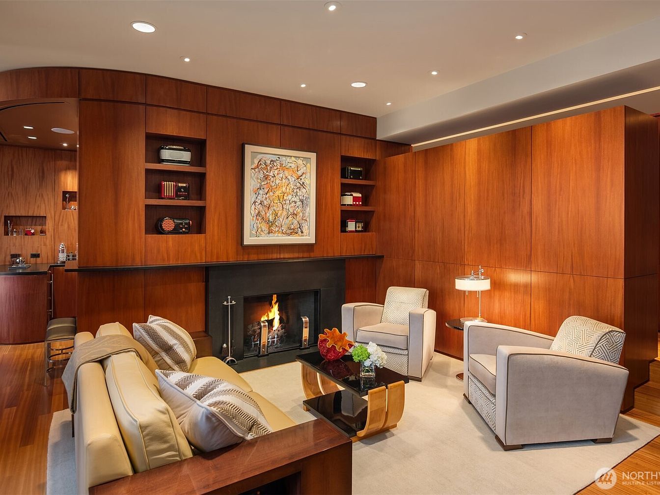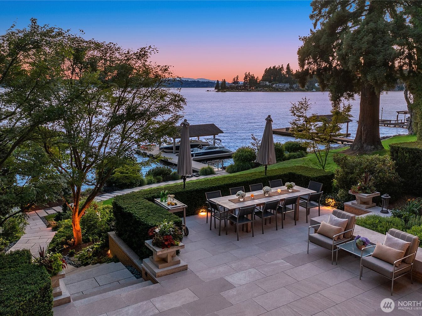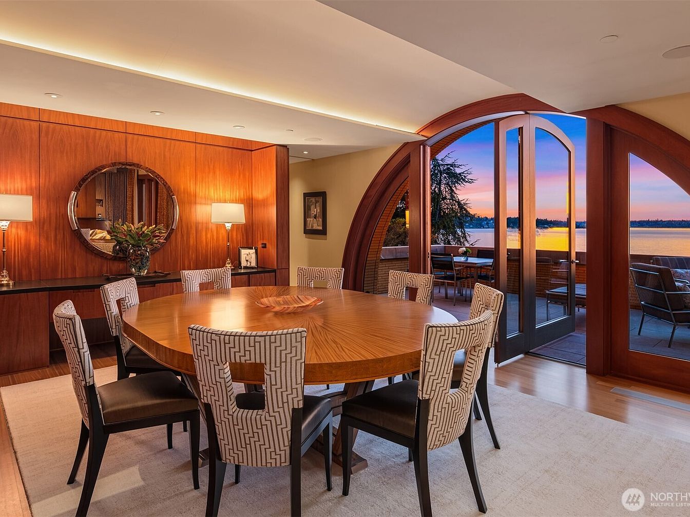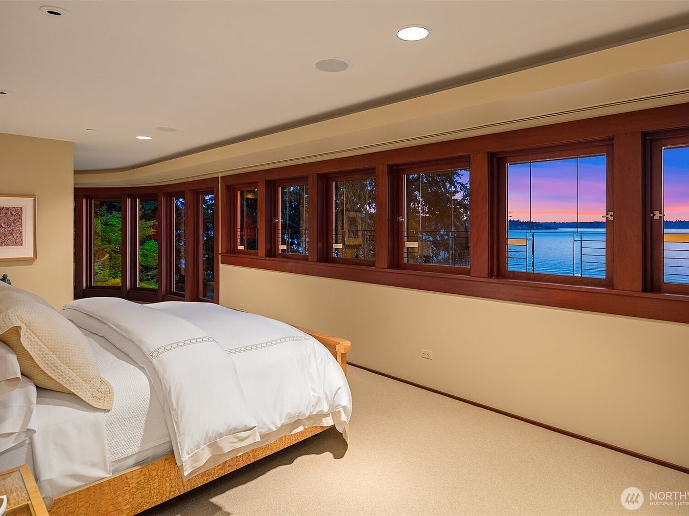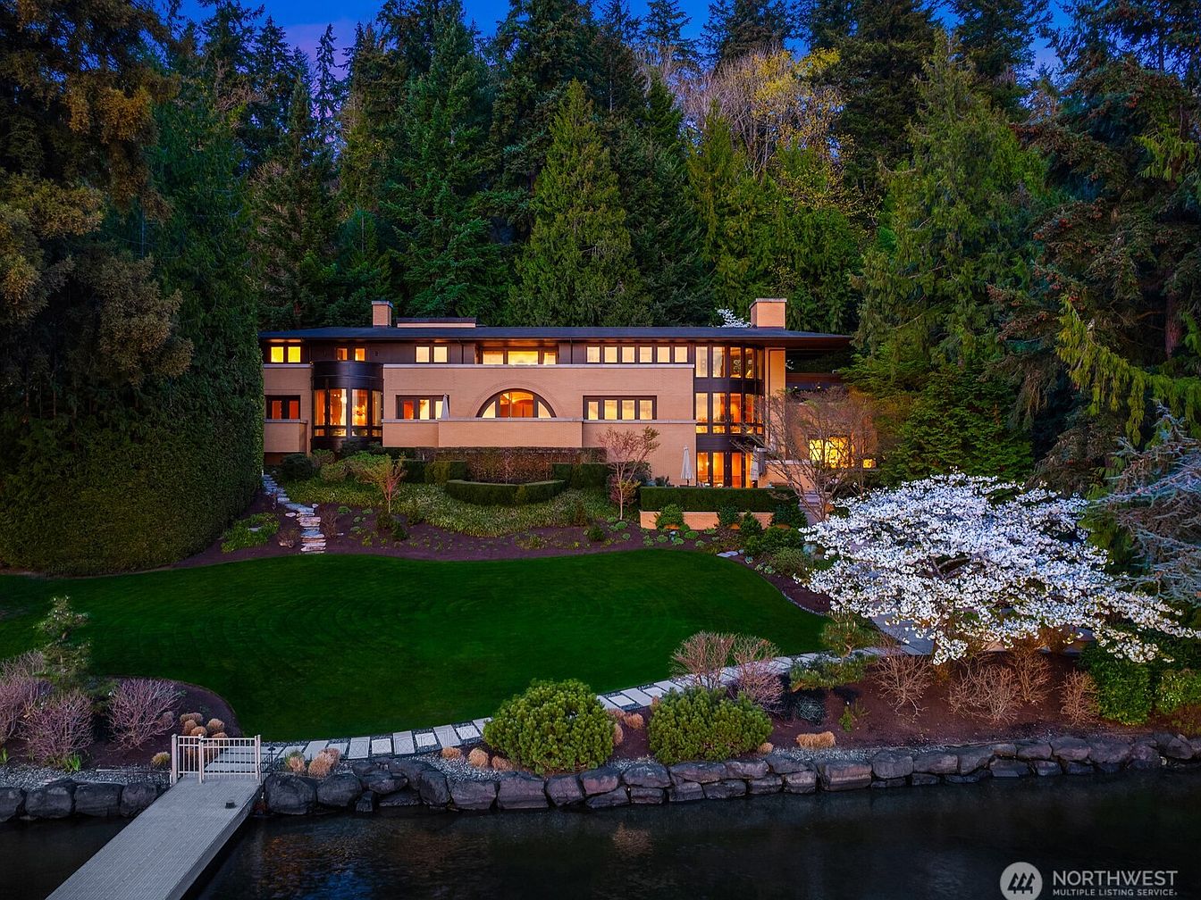 This exquisite home is a Tom Kundig-designed architectural masterpiece, reflecting the spirit of Frank Lloyd Wright through its seamless blend of traditional and modern elements. The exterior showcases a sophisticated combination of brick, mahogany, limestone, and copper, creating a warm and timeless façade. Inside, the residence features Art Deco elegance with stunning book-matched Honduran mahogany walls and luxurious African mahogany floors throughout, emphasizing the home’s refined craftsmanship and attention to detail. Situated in Bellevue, Washington, this property boasts nearly 2 acres of land with 135 feet of prime waterfront frontage, providing spectacular west-facing sunset views. Listed at $24,985,000, this exceptional estate offers an unparalleled living experience in a coveted location.