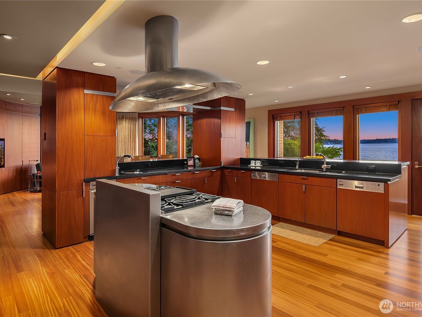 This kitchen features a contemporary layout centered around a stainless steel island with built-in cooktop and a distinctive rounded edge, topped by a sleek, large stainless steel range hood. Warm wooden cabinetry with minimalistic handles lines the walls, complemented by black granite countertops that provide a sharp yet subtle contrast. Expansive windows with wood frames fill the room with natural light and offer stunning waterfront views, creating a seamless indoor-outdoor connection. Warm-toned hardwood flooring enhances the inviting atmosphere, while recessed ceiling lights ensure ample illumination, making this kitchen both stylish and functional.