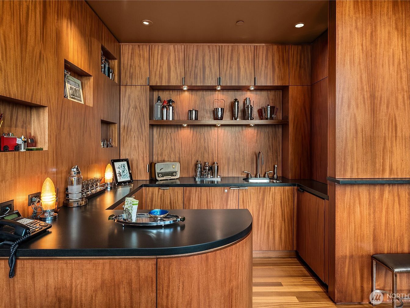 This intimate wet bar area features rich, warm wood paneling that envelops the space, creating a cozy and elegant atmosphere. The cabinetry and walls showcase a seamless grain pattern with a smooth matte finish, complemented by sleek black countertops that provide a modern contrast. Built-in shelves display an assortment of barware and vintage accents under subtle recessed lighting, highlighting the functional yet stylish elements. The bar includes dual sinks with minimalistic faucets, with a curved counter offering a comfortable serving space. Ambient lighting and small decor items enhance the sophisticated, mid-century inspired aesthetic of the setting.