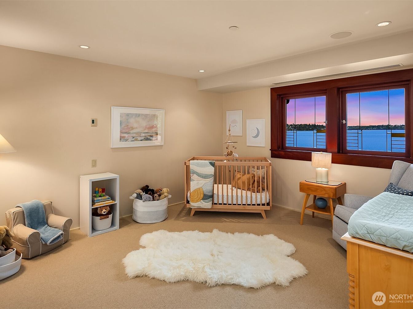This nursery offers a cozy, warm atmosphere with soft beige walls complementing a tan carpeted floor. A natural wood crib is positioned near large windows framed in rich wood, showcasing a stunning lake and sunset view that adds serenity. The space includes a small cushioned armchair draped with a blue throw, a plush white rug that provides softness underfoot, and simple, minimalist shelving for toys and books. Muted artwork depicting clouds and moons adorns the walls, enhancing the tranquil, gentle aesthetic. A small wooden side table with a lamp offers subtle, warm lighting, perfect for nighttime care.