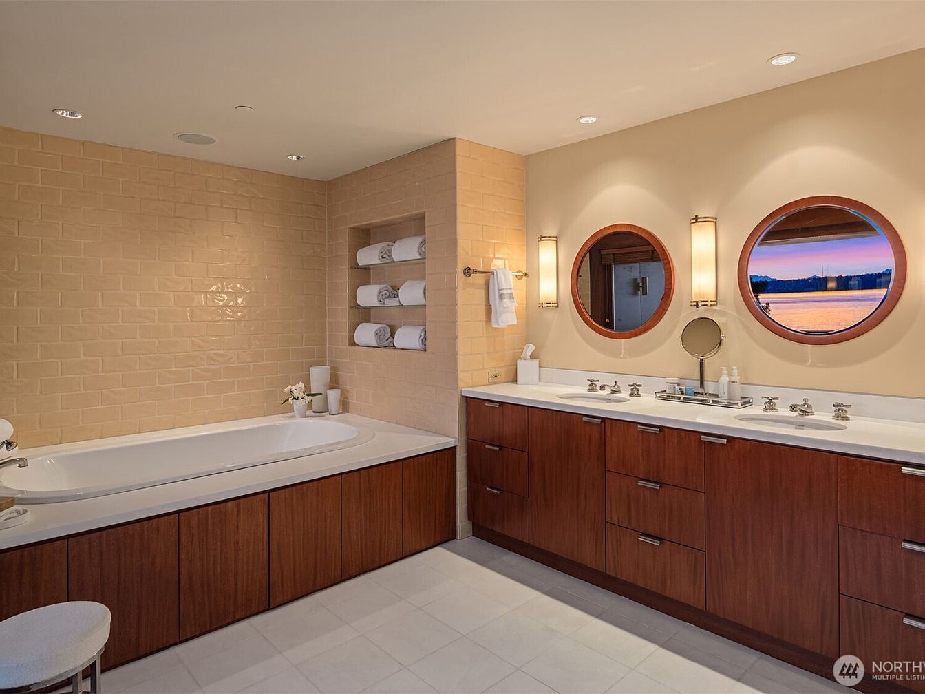 This spacious master bathroom features a warm, earthy palette with light beige tile walls surrounding a large built-in bathtub clad in wood cabinetry matching the double-sink vanity. The vanity is topped with a sleek white countertop and complemented by chrome fixtures and hardware. Two round mirrors with rich wooden frames are centered above the sinks, each illuminated by elegant, vertically mounted wall sconces. A built-in shelving nook perfectly houses neatly rolled white towels for easy access. The design integrates clean lines, warm wood tones, and soft, ambient lighting, creating a calming and polished retreat environment.