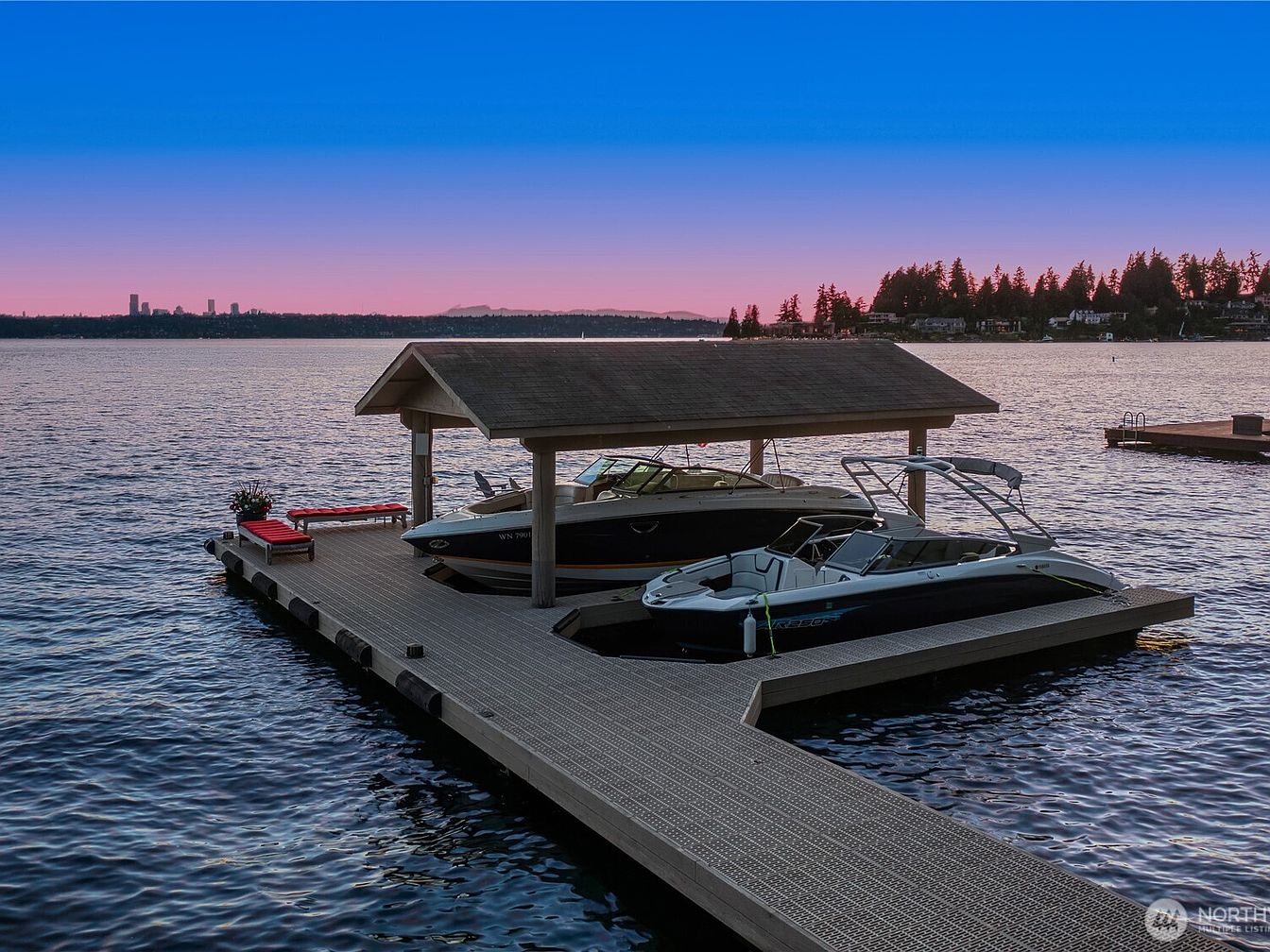 This inviting private dock extends over calm water, featuring two sleek boats nestled in covered slips to protect them from the elements. The dock is crafted with a textured, light-gray surface for safety and visual appeal. Alongside the boats, two cushioned loungers with deep red upholstery provide a stylish spot for relaxation by the water. Potted flowers at the dock’s edge add a touch of warmth and color. In the background, a serene lake stretches out, framed by distant city skylines and tall trees under a striking gradient sky transitioning from soft pink to deep blue, enhancing the peaceful ambiance.