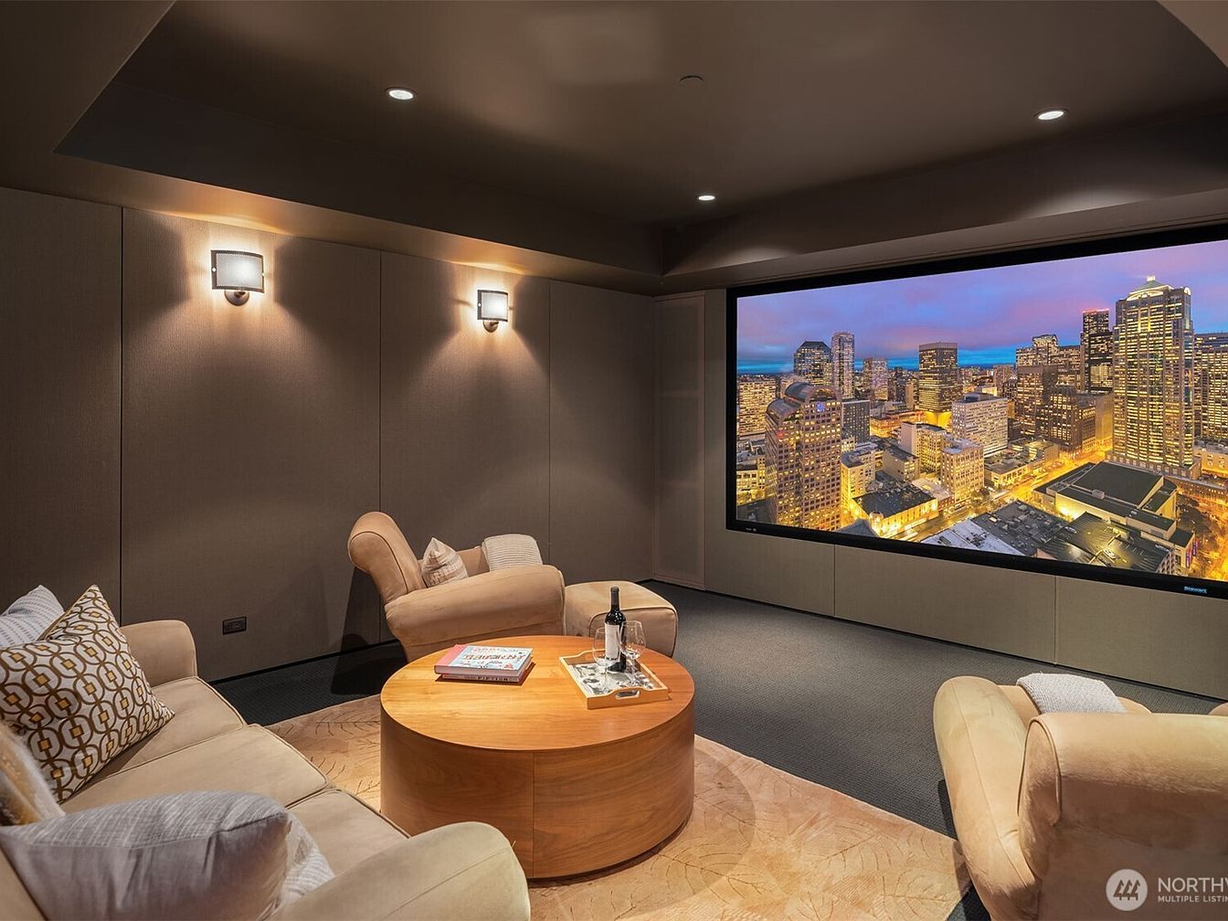 This cozy home theater lounge features a soft, muted color palette with taupe and beige walls and carpeting. Plush, cushioned armchairs and a streamlined sofa provide a comfortable seating arrangement around a round wooden coffee table, which holds a tray with a wine bottle and glass, adding a touch of relaxation and sophistication. The room is softly illuminated by modern wall sconces, creating an inviting ambiance. A large screen dominates one wall, perfect for immersive movie viewing. The overall design balances comfort and style, turning this intimate space into an elegant entertainment retreat.