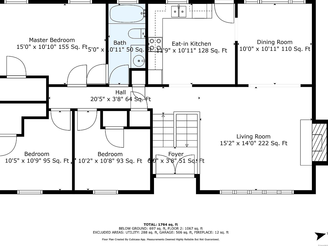 This floor plan presents a well-organized single-level home spanning 1,764 square feet. The layout includes a spacious living room measuring 15’2″ by 14′, designed for comfort and social gatherings, connected seamlessly to a dining room and an eat-in kitchen, emphasizing an open, functional flow. Three bedrooms are positioned for privacy, with the master bedroom featuring generous dimensions of 15′ by 10’10”. A centrally located bath serves the bedrooms and common areas. The foyer provides a welcoming entrance, and a long hall connects living spaces with bedrooms efficiently. The overall plan balances practicality and comfort.