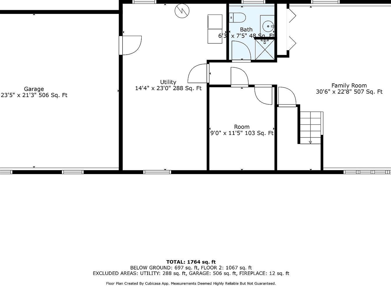 This basement layout offers a spacious and practical design, including a large garage of 506 square feet positioned on one side, ideal for parking and storage. Adjacent is a utility room spanning 288 square feet, providing ample space for laundry and home systems. A compact bathroom is accessible from the utility area, adding convenience. Next to it is a smaller multipurpose room measuring 103 square feet, suitable for an office or storage. The expansive family room, over 500 square feet, creates a welcoming recreational or relaxation zone, connected to the stairway leading upstairs, making this level functional and versatile.