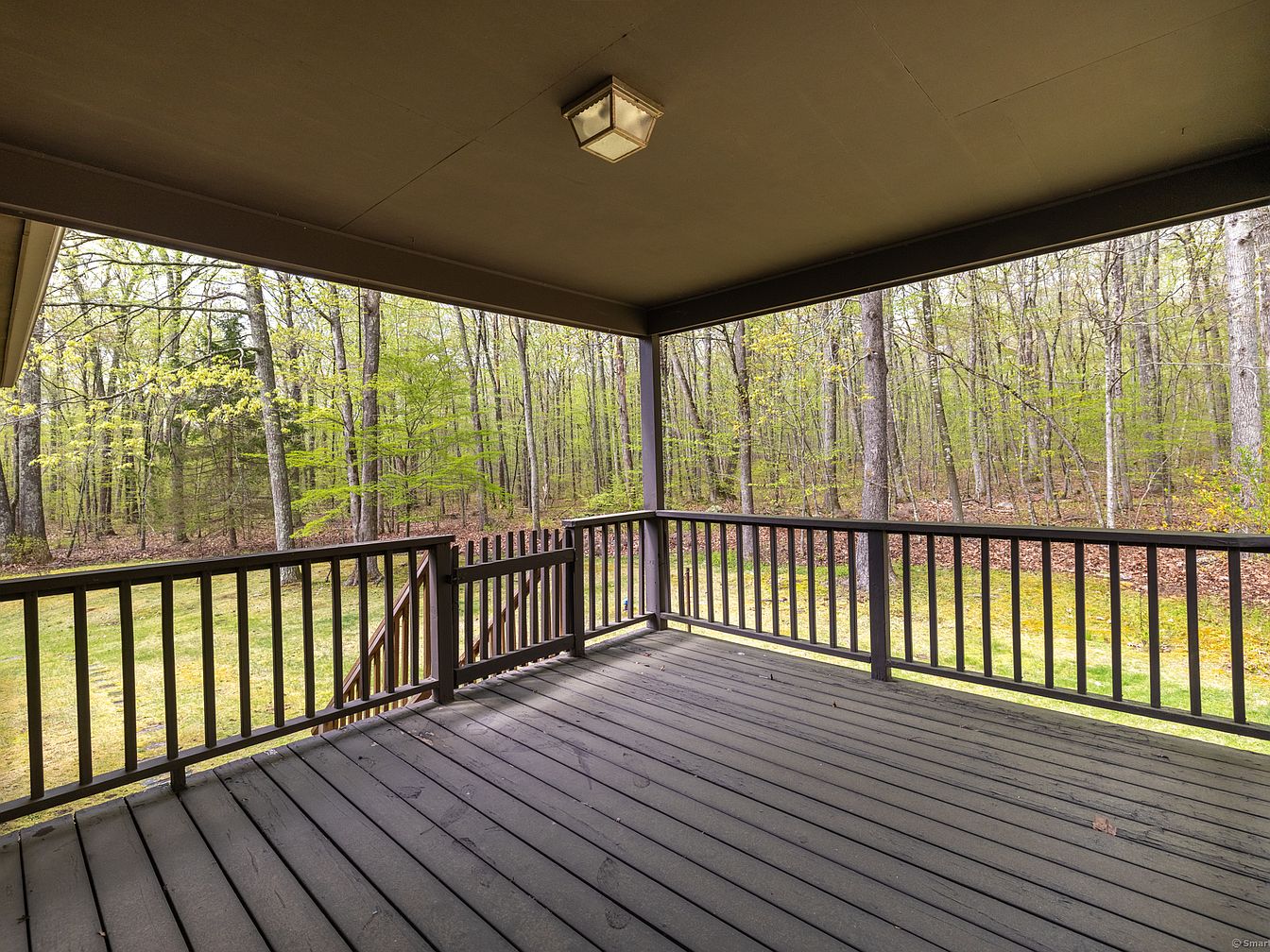 This spacious covered deck is an inviting outdoor retreat, featuring dark wooden plank flooring and matching railings for a cohesive look. The railing surrounds the deck on three sides, with a small gate opening to stairs that lead gently down to the grassy backyard. The ceiling is painted in a muted, earthy tone with a simple square light fixture centered overhead for soft illumination. Surrounded by a serene wooded landscape, the deck offers a private and peaceful vantage point to enjoy nature, perfect for relaxation or entertaining guests in an intimate setting.