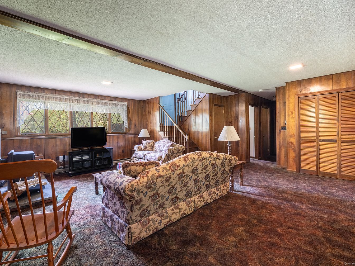This spacious family room features warm, vintage wood paneling covering all the walls, giving the space a rustic, cabin-like atmosphere. The carpet is a deep brown with a subtly mottled pattern, adding texture and warmth to the floor. A floral-patterned sofa and loveseat with soft, muted hues anchor the seating area, offering a comfortable spot for companionship and relaxation. An elegant wooden rocking chair adds a nostalgic touch. Large windows with diamond-patterned panes bring in natural light while sheer lace curtains soften the view. A classic wooden staircase with spindled railings is visible, enhancing the room’s inviting charm. Muted lighting complements the cozy ambiance.