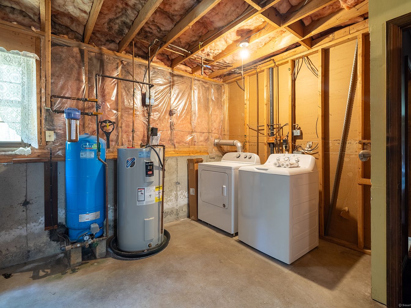 This utility room serves as a functional laundry and water system space. It features exposed wooden studs and insulation with plastic covering, highlighting an unfinished basement style. The concrete floor anchors the room, adding a durable and practical element. On one side, a modern washer and dryer set sit adjacent to a large blue water pressure tank and a gray water heater, all neatly installed. Natural light filters softly through a small window with a lace curtain, softening the industrial feel. The warm wooden trim and ceiling beams contrast with the concrete and metal fixtures, combining utility with basic rustic charm.