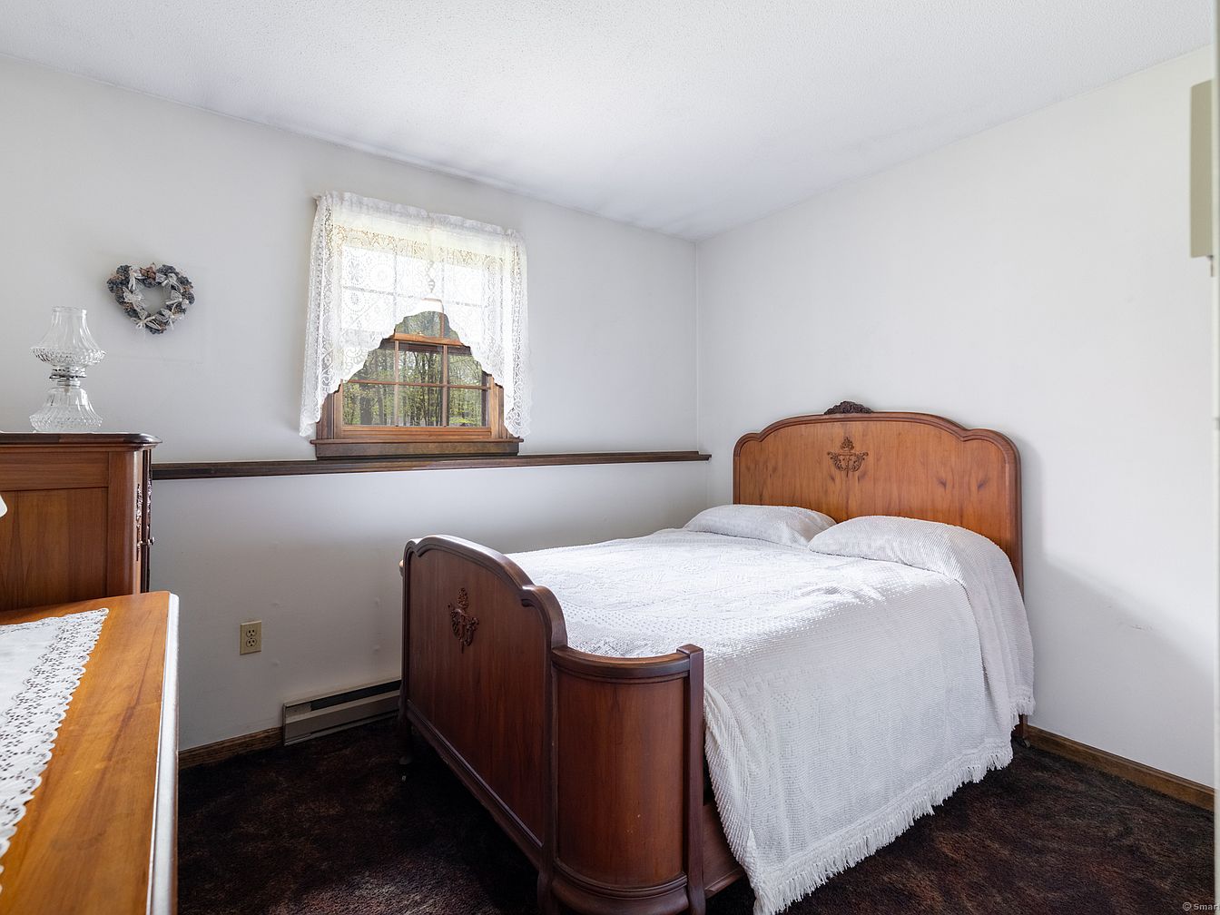 This intimate bedroom features classic wooden furniture with rich tones, including a carved bed frame and matching dresser. The bed is adorned with a textured white bedspread that adds a soft contrast to the dark wood. A single window dressed with delicate lace curtains allows natural light to gently fill the space, emphasizing the neutral walls and wooden trim. The room has a simple yet charming vintage aesthetic, complemented by a heart-shaped wreath and an ornate glass lamp. The cozy atmosphere is enhanced by a plush dark carpet that anchors the design.