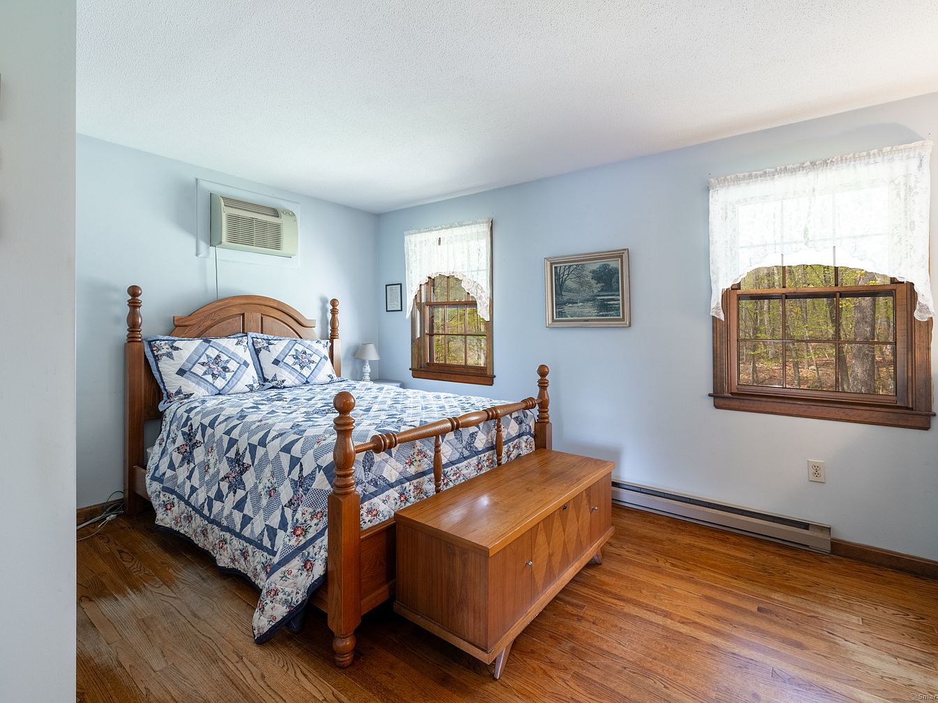 Soft blue walls create a calming atmosphere in this inviting bedroom, complemented by warm wood accents throughout. The wooden bed frame, with its turned posts and arched headboard, is dressed in a charming blue and white quilt featuring floral and geometric patterns. Two windows, dressed with lace curtains, offer natural light and a scenic view of the surrounding trees, framed in rich wood trim matching the hardwood floor. A wooden storage bench at the foot of the bed adds practical seating and extra storage. The room’s simple decor, including a classic landscape painting and a bedside lamp, further enhances the tranquil, homey feel.