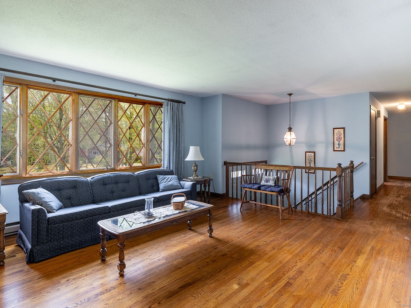This upper landing features warm-toned hardwood flooring that extends seamlessly across the space, complemented by light blue painted walls creating a calming, airy ambiance. Large, diamond-patterned bay windows with wooden frames bring in an abundance of natural light, offering inviting views of the outdoors. A classic navy upholstered sofa with simple tufting sits beneath the windows, accompanied by a wooden coffee table with a glass inset. Adjacent to the stair railing, a wooden bench with blue cushions and vintage-style pendant lighting form a cozy nook. Traditional furnishings and muted tones evoke a timeless, serene atmosphere.