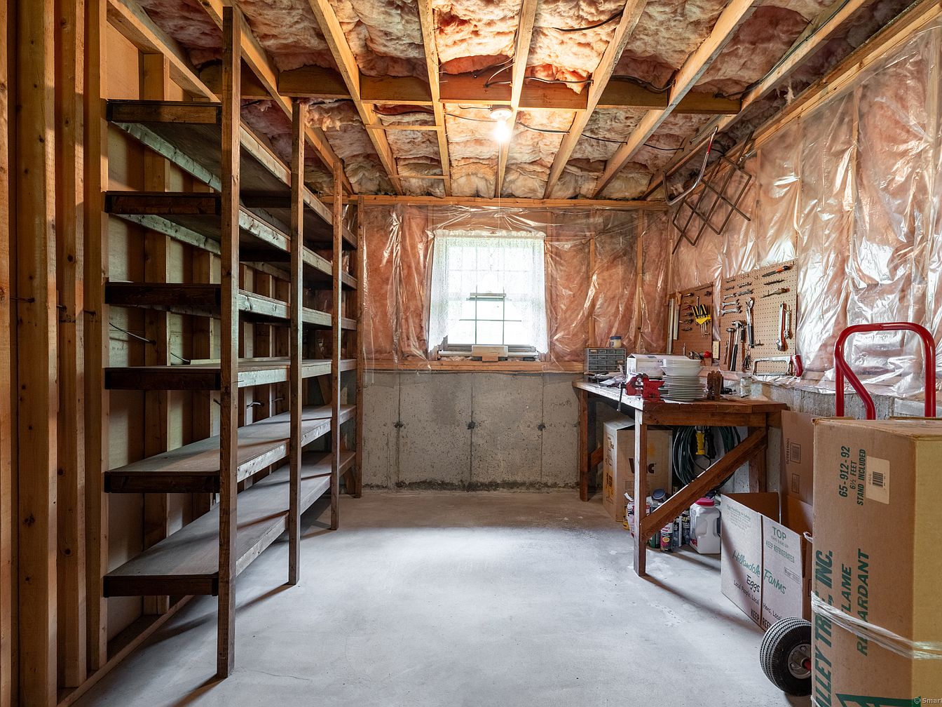 This unfinished basement area functions as a practical workshop and storage space. Exposed wooden framing and insulation line the walls and ceiling, with clear plastic sheeting partially covering them. A single window is adorned with a lace curtain, allowing natural light to filter in, brightening the raw concrete floor and foundation walls. On one side, sturdy wooden shelves provide ample storage, while the opposite wall holds a long workbench cluttered with tools, supplies, and equipment. Pegboards mounted above the bench organize various hand tools, reflecting a utilitarian, hands-on aesthetic geared toward DIY projects and maintenance work.