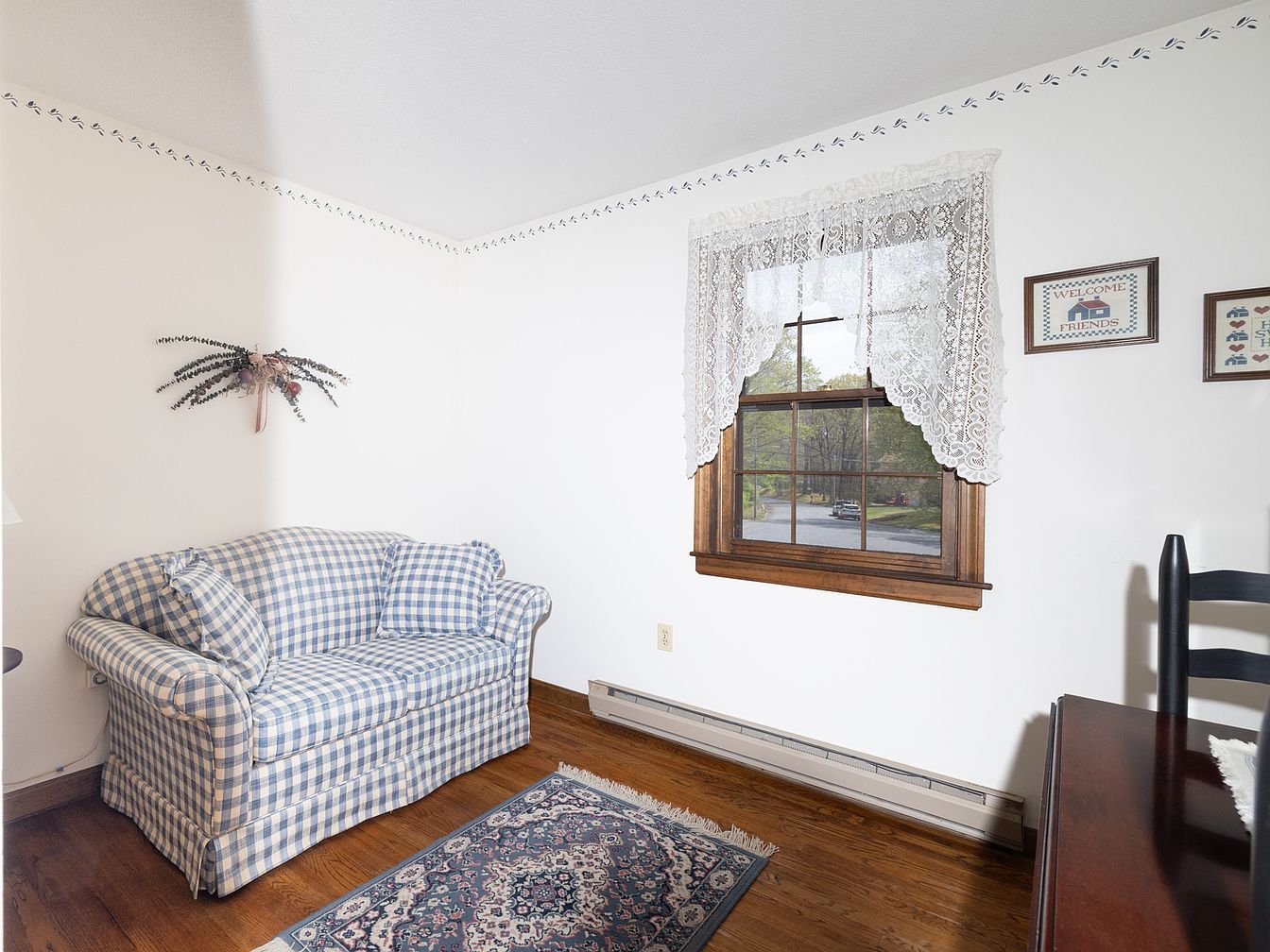 This intimate nook features a blue and white checkered loveseat that brings a charming, country-style vibe to the space. The hardwood floor adds warmth, complemented by a traditional patterned area rug with intricate designs in blue and beige hues. The window framed in rich wood is dressed with delicate lace curtains, allowing natural light while maintaining privacy. White walls are accented with a subtle decorative border near the ceiling, enhancing the vintage aesthetic. Wall decor includes welcoming framed quotes and a simple floral twig arrangement, creating a quaint, inviting ambiance perfect for casual relaxation.