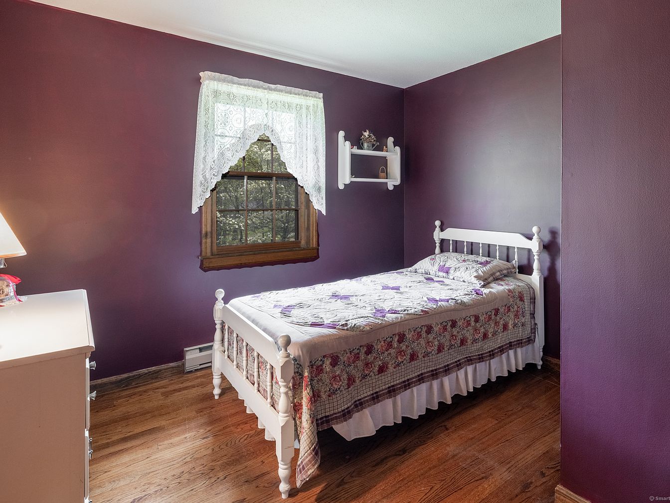 This intimate bedroom corner embraces a deep purple wall palette, offering a warm and inviting atmosphere. The hardwood floor adds natural texture and richness beneath a charming white spindle bed that contrasts beautifully with the darker hues. The bed is dressed in a quilt featuring floral and geometric patterns, incorporating soft purples and reds that enhance the room’s cozy feel. A lace-curtained window framed in dark wood allows filtered natural light to gently illuminate the space. A small white dresser and matching wall shelf provide subtle decorative and practical accents, completing this quaint restful retreat.