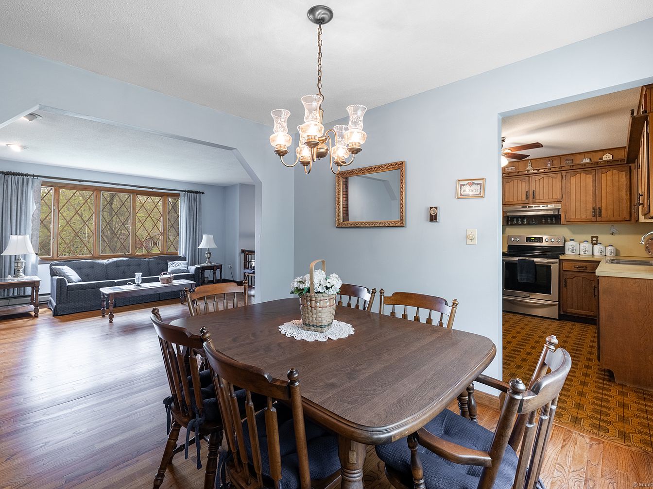 This cozy dining area features a large wooden table with six matching chairs, all in a rich walnut finish, accented by dark cushioned seats for comfort. The walls are painted a soft, pastel blue, creating a calming atmosphere, complemented by the warm wooden flooring that extends seamlessly into the adjacent living space and kitchen. A delicate chandelier with vintage-style glass shades hangs above the table, adding a classic touch to the setting. A framed mirror on the wall enhances the room’s depth, while large windows with diamond-patterned panes in the living area allow ample natural light to brighten the space. The nearby kitchen boasts medium wood cabinetry and stainless steel appliances, combining functionality with traditional charm for a welcoming home environment.
