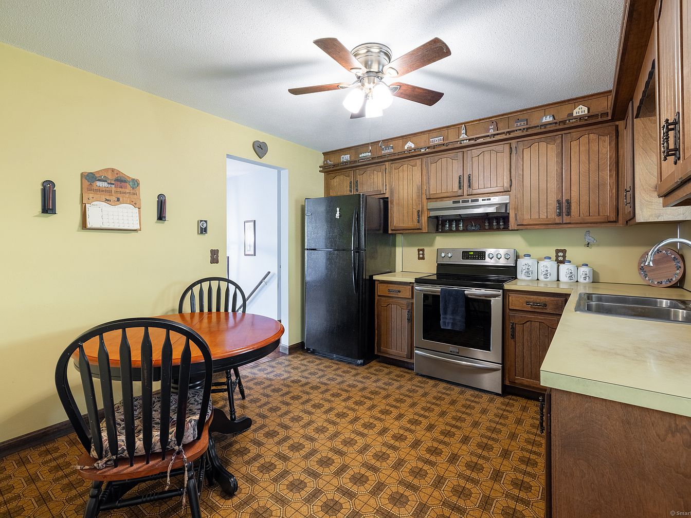 This kitchen features a warm, inviting atmosphere with classic wood cabinetry extending along the walls, topped with a row of quaint decorative house models. A compact dining area holds a round wooden table with two black spindle-back chairs, perfect for casual meals. The walls are painted a soft yellow, complementing the retro-style patterned vinyl flooring in amber and brown tones. Appliances include a black refrigerator and a stainless steel oven with a matching range hood. A ceiling fan with wood blades provides both airflow and a cozy touch. The countertops are a muted beige, and a stainless steel sink is situated beneath additional cabinetry, blending functionality with a nostalgic, homey style.