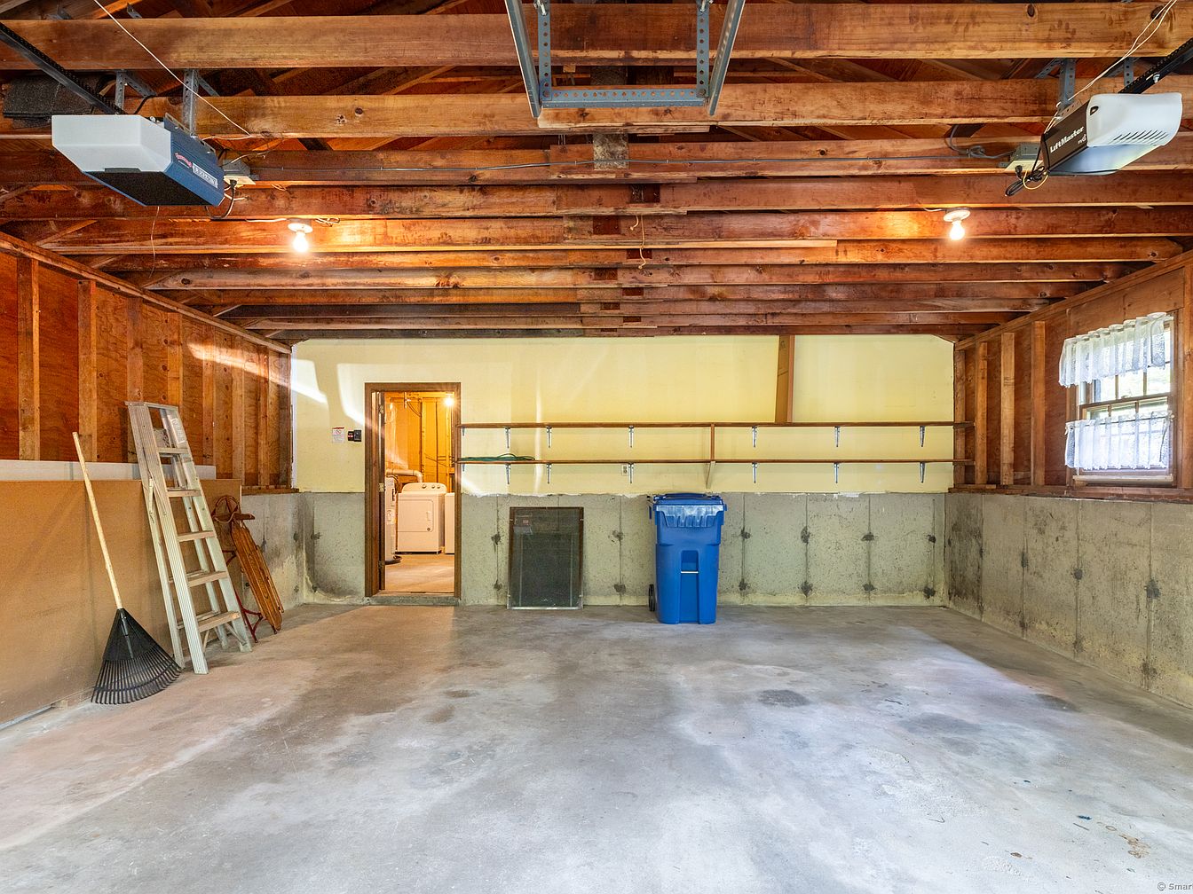 This spacious garage features exposed wooden ceiling beams and unfinished wooden walls, giving it a rustic and utilitarian charm. The concrete floor offers durability and functionality for vehicle parking or storage. Along one wall, sturdy metal brackets support long wooden shelves, providing practical storage space. Natural light filters in through a window adorned with delicate sheer white curtains, softening the otherwise rugged environment. The garage door opener is mounted on the ceiling, indicating ease of access. Adjacent to the garage, an open doorway leads to a laundry area, visible with washer and dryer appliances, enhancing the home’s utility.
