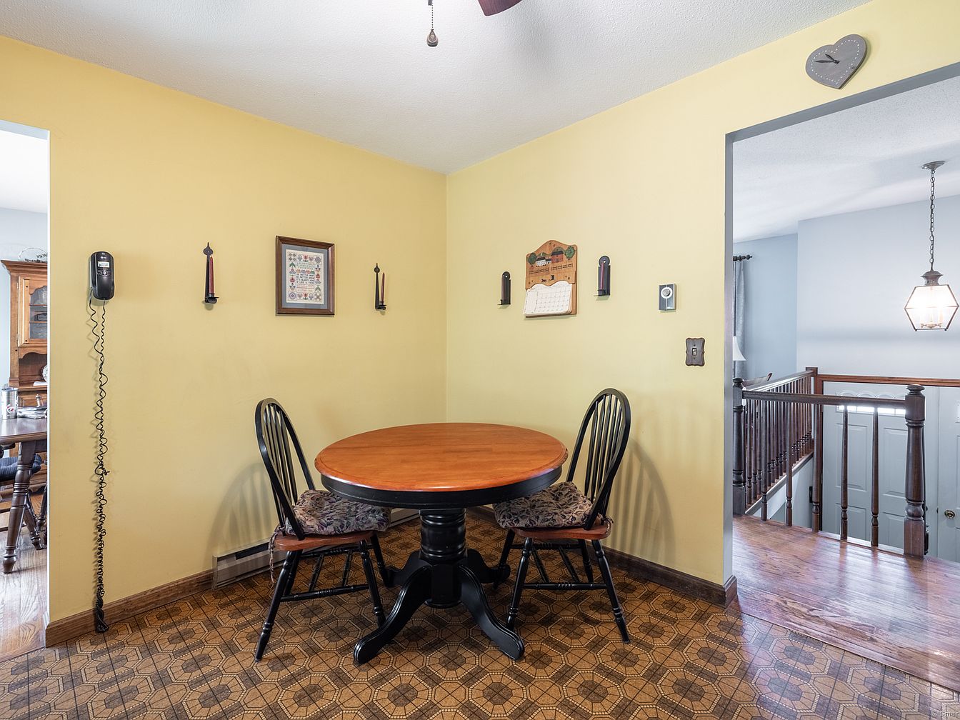 This inviting breakfast nook features soft yellow walls that create a warm, cheerful atmosphere. The space is defined by a round wooden table with a rich, polished surface and a classic black pedestal base, paired with two matching black spindle-back chairs, each adorned with cushioned, patterned seats for added comfort. The patterned floor tiles add a retro charm while complementing the wood tones throughout. Wall-mounted accents, including a vintage calendar and small decorative sconces, add personality. Adjacent to an open doorway, this nook offers a quaint spot for casual dining, seamlessly connecting to a hallway with elegant dark wood balustrades.