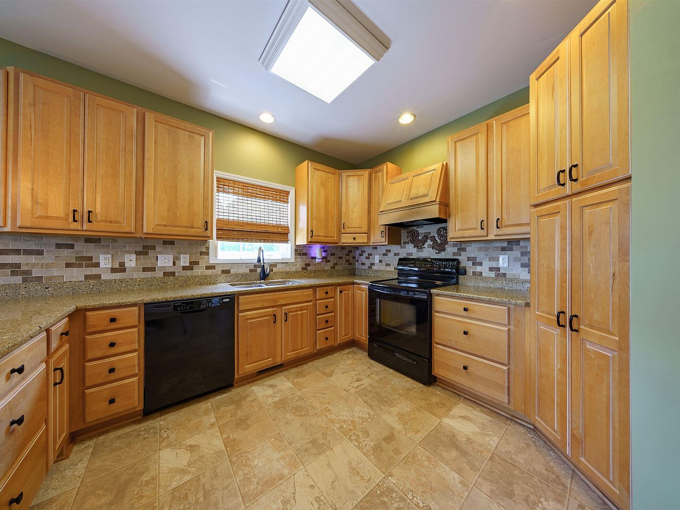 This kitchen features an L-shaped layout with a spacious countertop area composed of speckled granite. The cabinetry, made from light natural wood with a smooth finish, provides ample storage and complements the earth-toned tile flooring. The backsplash consists of neutral mosaic tiles in varying shades of beige and taupe, adding texture and visual interest. A black oven and dishwasher contrast with the lighter wood cabinets, while a wooden range hood blends seamlessly with the cabinetry above the stove. Soft green walls add warmth, and a single window above the sink brightens the space with natural light, enhanced by a woven bamboo shade. Ceiling recessed lights and a central light fixture create even, warm illumination throughout the kitchen.