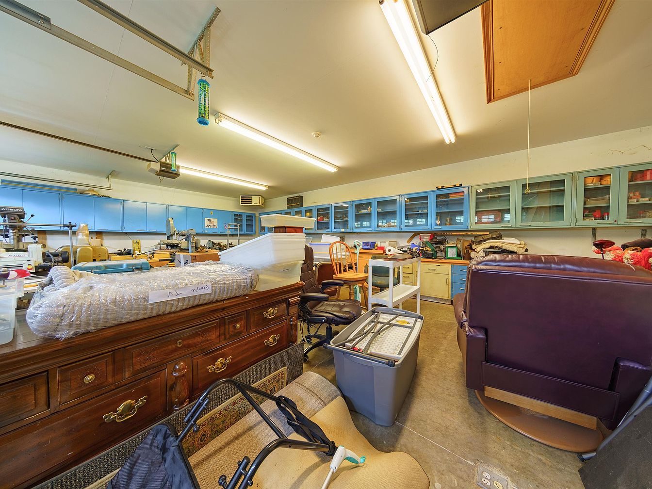 This spacious garage has been adapted into a multifunctional workspace, mixing storage with crafting and repair areas. The room features a long workbench with blue and cream cabinetry extending across the back wall, offering ample storage behind both solid and glass-front cabinet doors. Overhead fluorescent lights illuminate the space brightly. Various furniture pieces, including a large wooden dresser, leather swivel chair, wooden dining chair, and plastic storage bins, are scattered throughout, suggesting ongoing projects and organization. The concrete floor is practical for heavy-duty tasks, while the garage door tracks above hint at its original use. The aesthetics balance utility with a mix of vintage and functional elements.