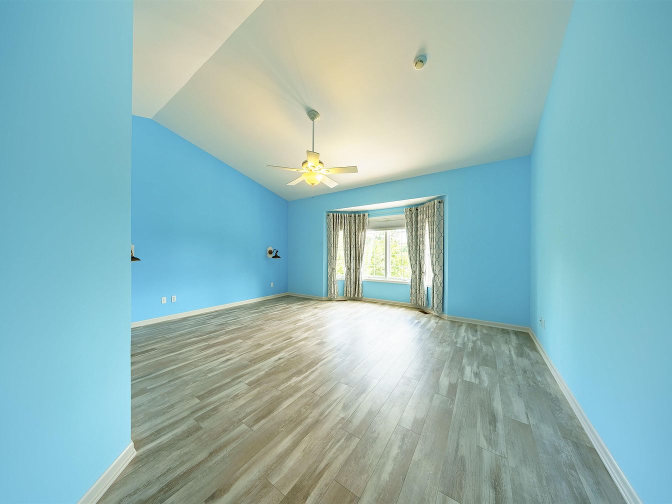 This spacious bedroom features soothing sky-blue walls paired with a light wood laminate floor that adds warmth and texture. The ceiling is vaulted, enhancing the room’s airy feel, and is painted white to complement the cool wall tones. A ceiling fan with a light fixture hangs in the center, offering both illumination and airflow. The room includes a large bay window dressed with patterned gray curtains, allowing natural light to filter in softly. Wall-mounted sconces are visible, offering additional lighting options and emphasizing the room’s clean, contemporary vibe.