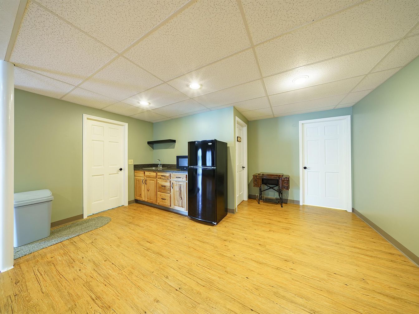 This basement kitchenette area features soft green walls paired with warm wood-toned flooring, creating a cozy yet practical environment. The drop ceiling with recessed lighting brightly illuminates the space, enhancing its functional feel. A compact black refrigerator stands next to a natural wood cabinet set topped with a dark countertop, including a small sink and a microwave. Two white paneled doors provide access to adjacent rooms, while a small vintage sewing machine table adds a charming, rustic touch to the clean and minimal design. The area is perfect for casual use or entertaining in the lower level.