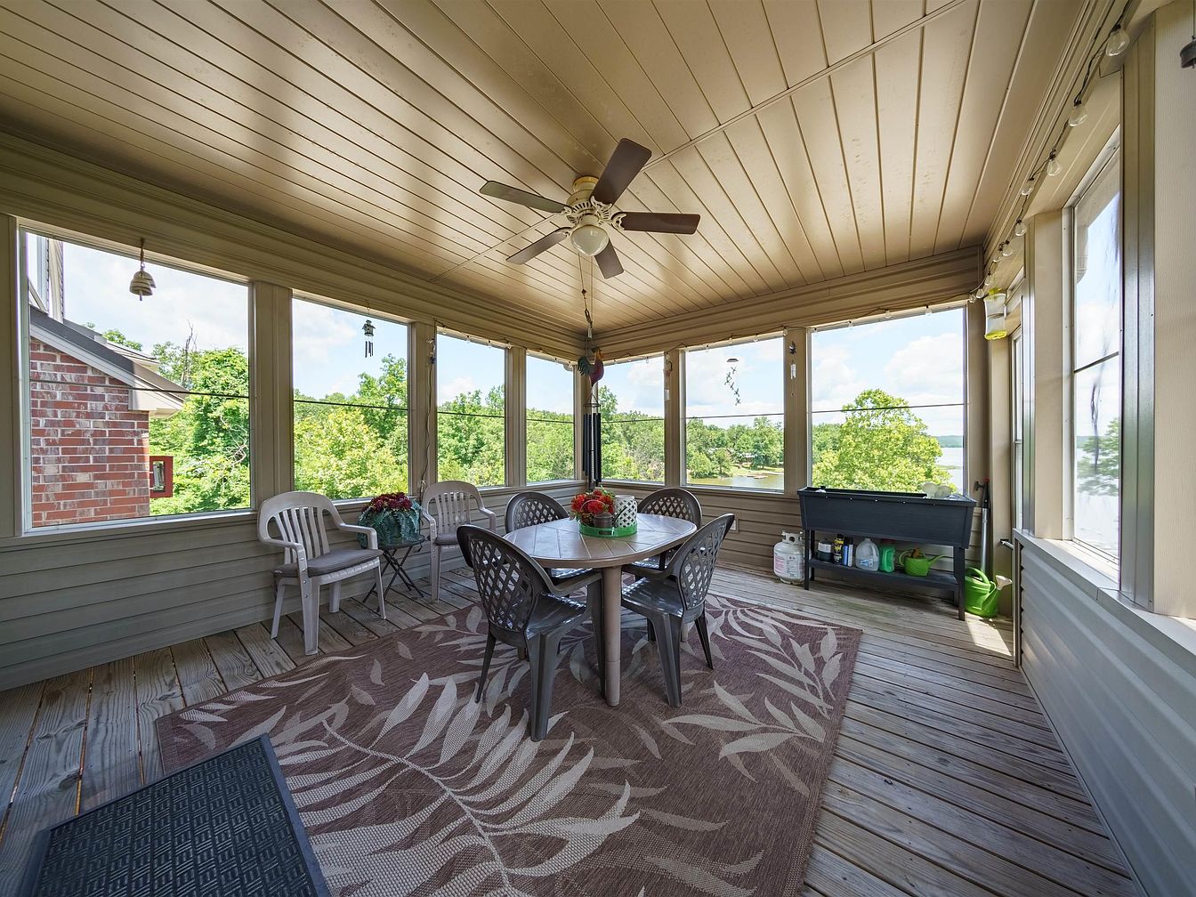 This screened porch offers a cozy outdoor dining experience with a natural wood-paneled ceiling and matching wooden floorboards. Neutral tones dominate the space, with beige walls and ceiling blending seamlessly into the natural wood textures. The area features a central dining table surrounded by four plastic chairs, two white and two grey, set atop a large brown area rug with leaf patterns, enhancing an earthy vibe. Large screened windows allow for panoramic views of lush greenery and distant water, bringing nature inside while allowing fresh air circulation. Ceiling fan and string lights add functional accents for comfort and ambiance.