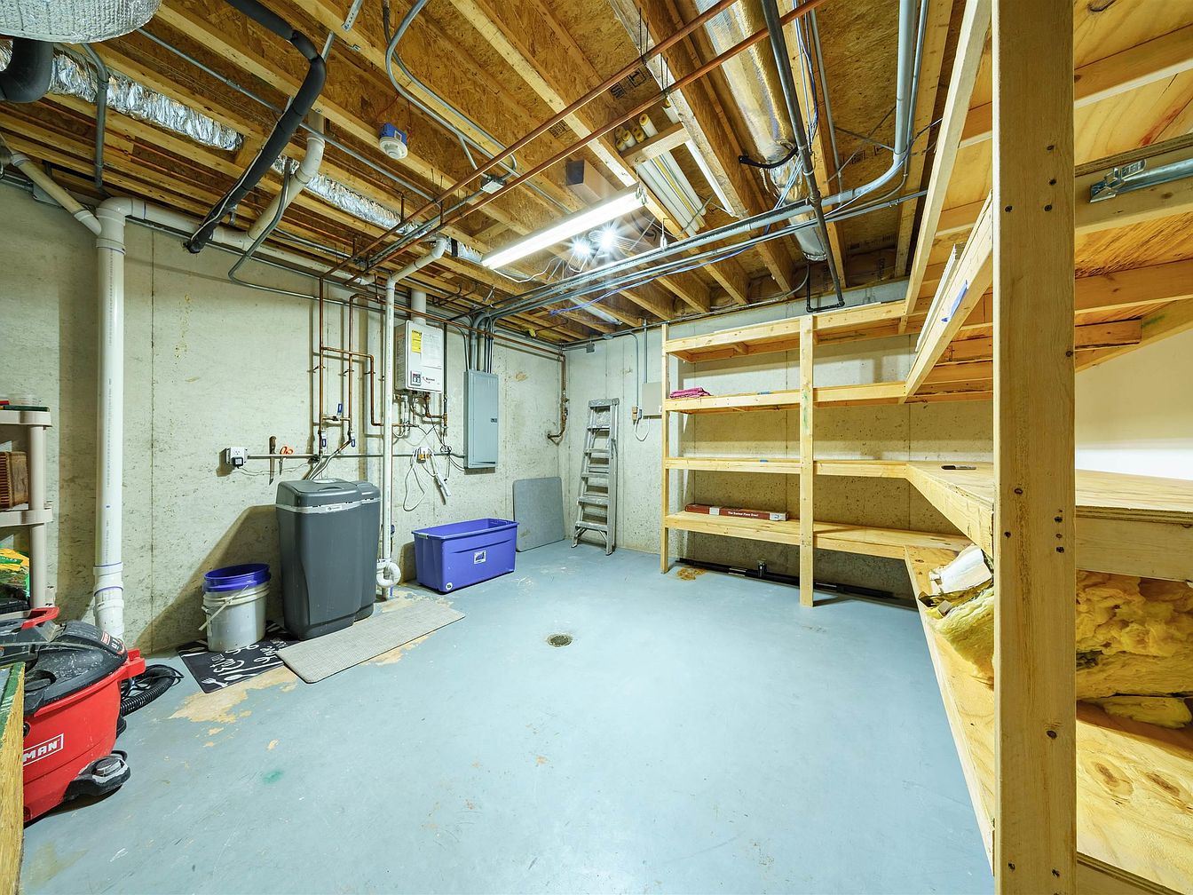 This spacious basement area is designed primarily for storage and utility purposes. Exposed wooden ceiling beams reveal a network of pipes and wiring, emphasizing a functional, unfinished aesthetic. The concrete block walls and painted concrete floor offer durability and easy maintenance. The right side features sturdy wooden shelving units, perfect for organizing tools, supplies, or household items. A ladder leans against the far wall alongside an electrical panel and water softener unit, highlighting practical home systems. Bright fluorescent lighting ensures the space is well-illuminated, making this basement an efficient and accessible storage solution.