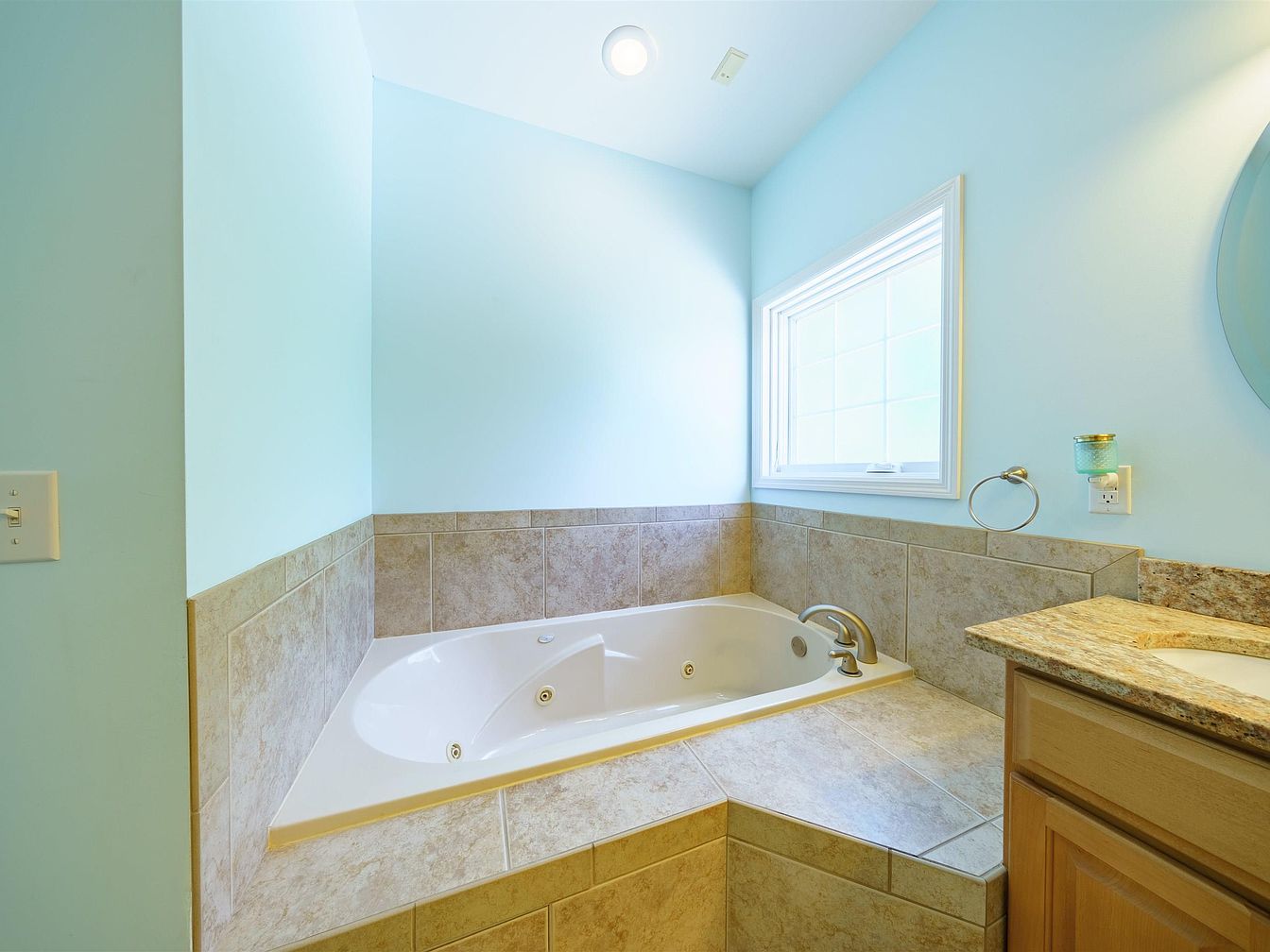 This serene bathroom corner features a spacious built-in bathtub surrounded by neutral beige tiles extending halfway up the walls and around the tub deck, providing a cohesive and clean look. The walls above are painted in a soft, calming light blue, enhancing the restful ambiance. A large, frosted window allows natural light to filter in gently, maintaining privacy while brightening the space. The adjacent granite countertop with wooden cabinetry offers warmth and practicality, completing a balanced combination of soft colors, natural materials, and functional design suited for relaxation.
