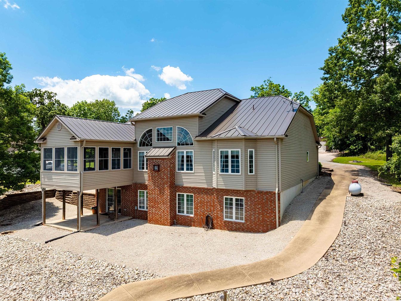 This multi-level home’s rear exterior features a blend of beige siding and red brick accents, creating a warm and inviting aesthetic. A striking feature is the elevated screened porch supported by sturdy wooden posts, offering ample space for outdoor relaxation while being shielded from the elements. Multiple windows with white trim provide natural light and architectural interest, including a large semi-circular window above the central section, enhancing the home’s visual appeal. The metal roofing ties together the modern and classic elements with durability and style. A curved concrete pathway and gravel landscape complement the surrounding mature greenery, adding a natural yet tidy touch to the backyard space.
