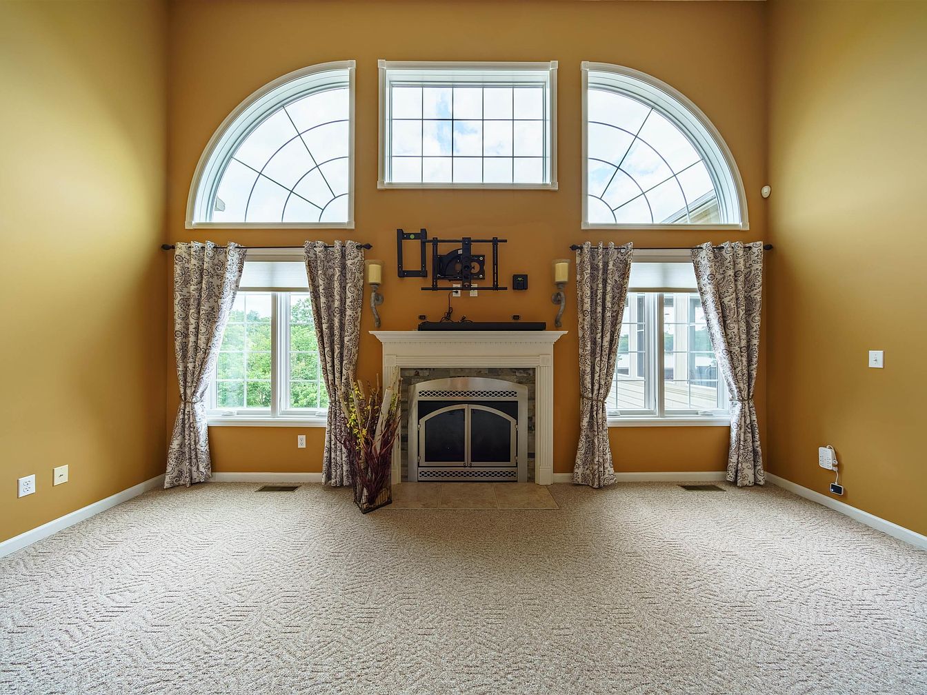 This living room features a warm, mustard-colored accent wall with a classic white mantel fireplace as the centerpiece. Above the fireplace, there is a wall mount for a TV, flanked by two decorative wall sconces with candle holders. The wall is brightened by three large windows: a rectangular window in the center and two elegant half-circle windows above the side windows, which are draped with patterned, soft beige curtains tied back neatly. The floor is covered with a textured light cream carpet, contributing to a cozy atmosphere. Architectural details emphasize symmetry and natural light.